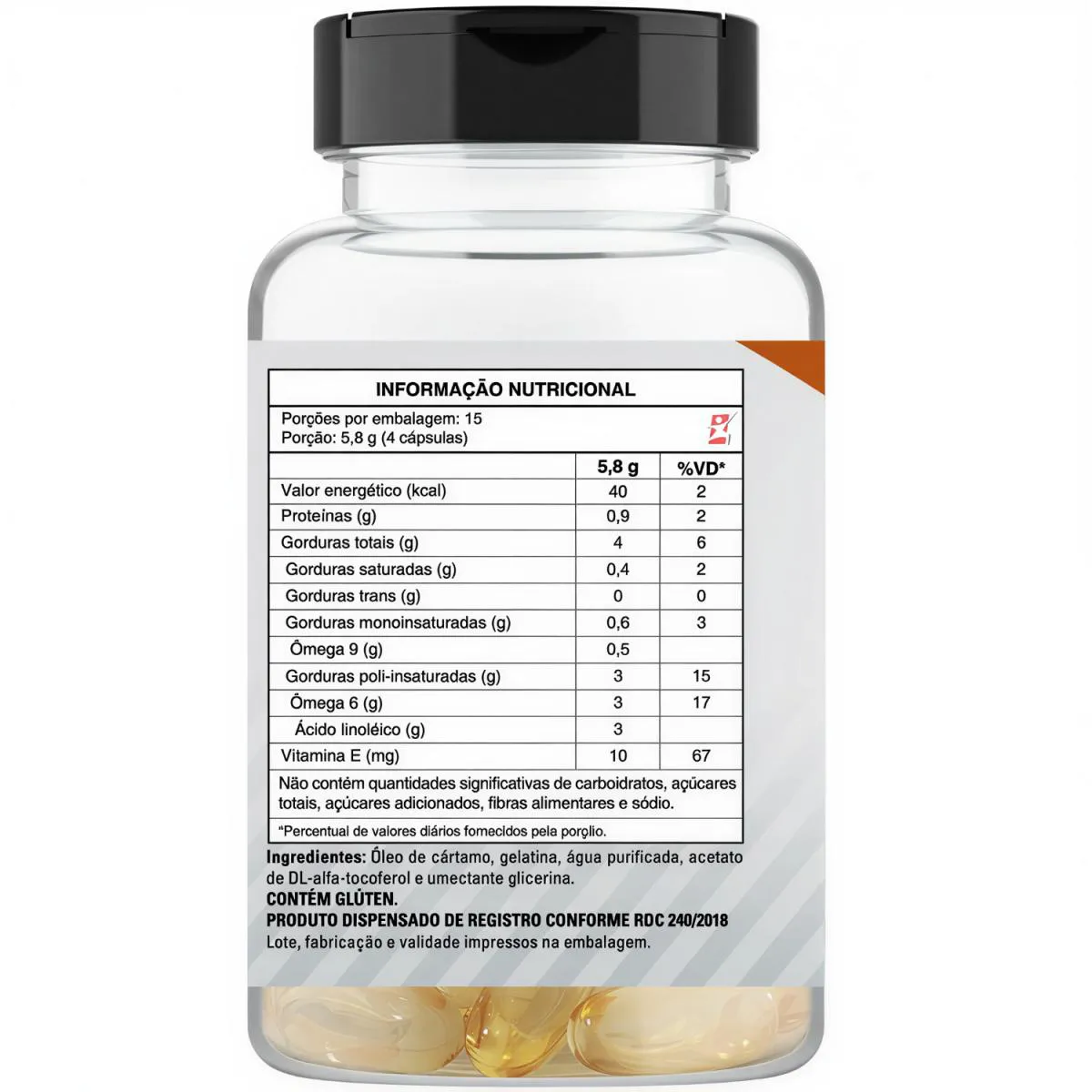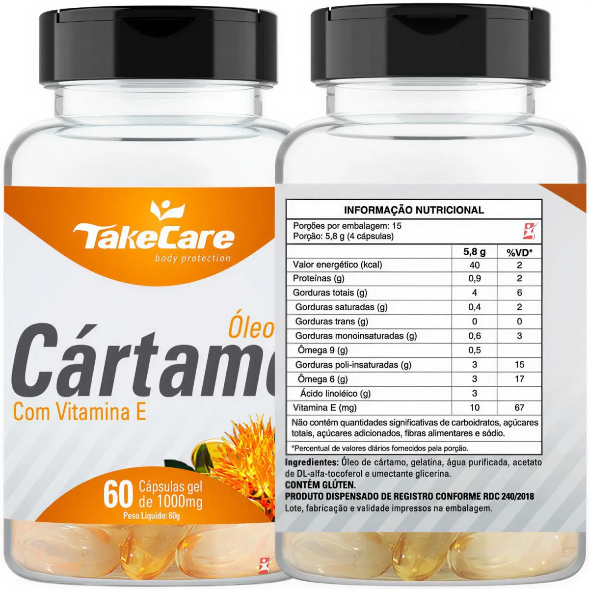 ÓLEO DE CÁRTAMO + vitamina e 1000MG 60 CÁPSULAS - TAKE CARE - descrição - INDÚSTRIA DO CORPO Óleo de Cártamo + Vitamina E possui ácidos graxos importantes para a função cerebral, sistema nervoso e também para o cardiovascular, além de auxiliar na redução do colesterol e possuir propriedade antioxidante. - benefícios - INDÚSTRIA DO CORPO - Melhora do metabolismo; - Diminui à vontade por doces; - Melhora do colesterol, triglicérides e glicose sanguíneos; - Melhora do metabolismo; - Melhora do colesterol; - Melhoria dos triglicérides, podendo contribuir com o ganho de massa magra - Redução na gordura corporal; - Auxílio na diminuição do apetite; - Antioxidante. - sugestão de uso - INDÚSTRIA DO CORPO Tomar 2 (duas) cápsulas 2 (duas) vezes ao dia, preferencialmente antes das principais refeições com o auxílio de água. - tabela nutricional - INDÚSTRIA DO CORPO EM ANEXO NAS IMAGENS - composição - INDÚSTRIA DO CORPO EM ANEXO NAS IMAGENS - recomendações - INDÚSTRIA DO CORPO EM ANEXO NAS IMAGENS - dados técnicos - INDÚSTRIA DO CORPO Marca - Take Care. Conteúdo líquido total - 60 cápsulas. Rendimento total - 15 doses/porções. Código de barras (EAN) - 7898411817484. Peso líquido do produto - 30g. Peso bruto - 150g. Peso aproximado produto + embalagem - 300g. Registro ANVISA - Dispensado de registro de acordo com a resolução da RDC 27/2010 e RDC 240/2018 da ANVISA. Dimensões do produto - largura: 6 cm; altura: 11 cm; comprimento: 6 cm. Dimensões da embalagem/pacote - largura: 13 cm; altura: 10 cm; comprimento: 16 cm. - itens do anúncio - INDÚSTRIA DO CORPO - 1 Unidade do produto: ÓLEO DE CÁRTAMO + VITAMINA E 1000MG 60 CÁPSULAS - TAKE CARE. Total - 60 Cápsulas.