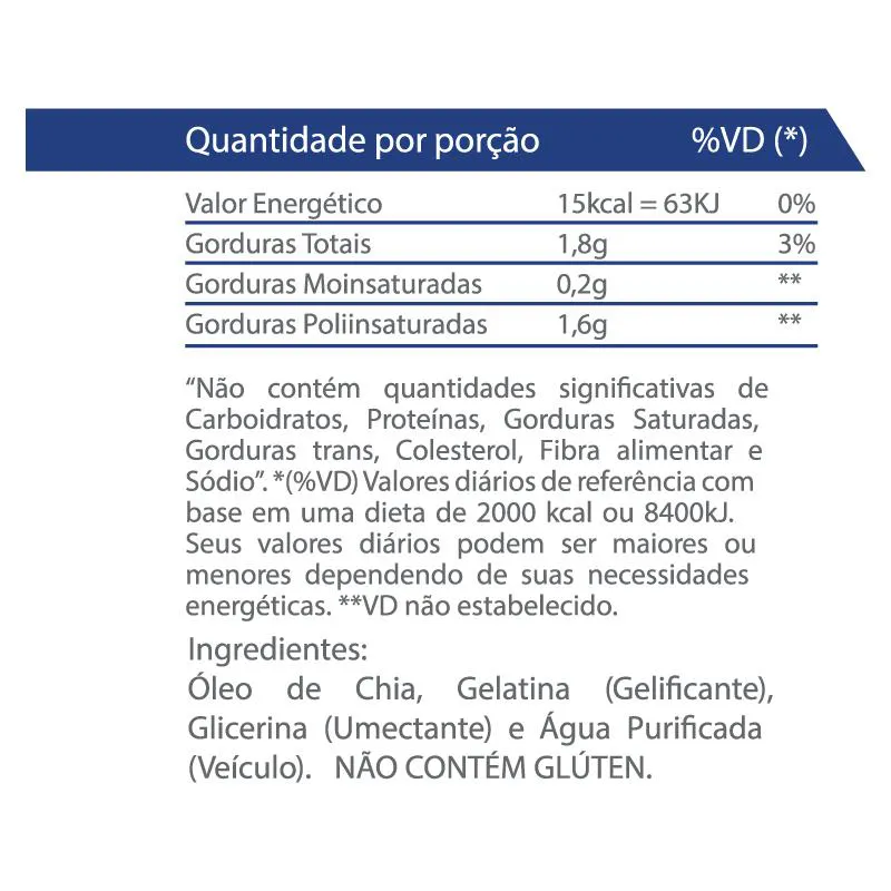 O Óleo de Chia da Vitaminlife em cápsulas é um suplemento alimentar à base do óleo da semente da chia.