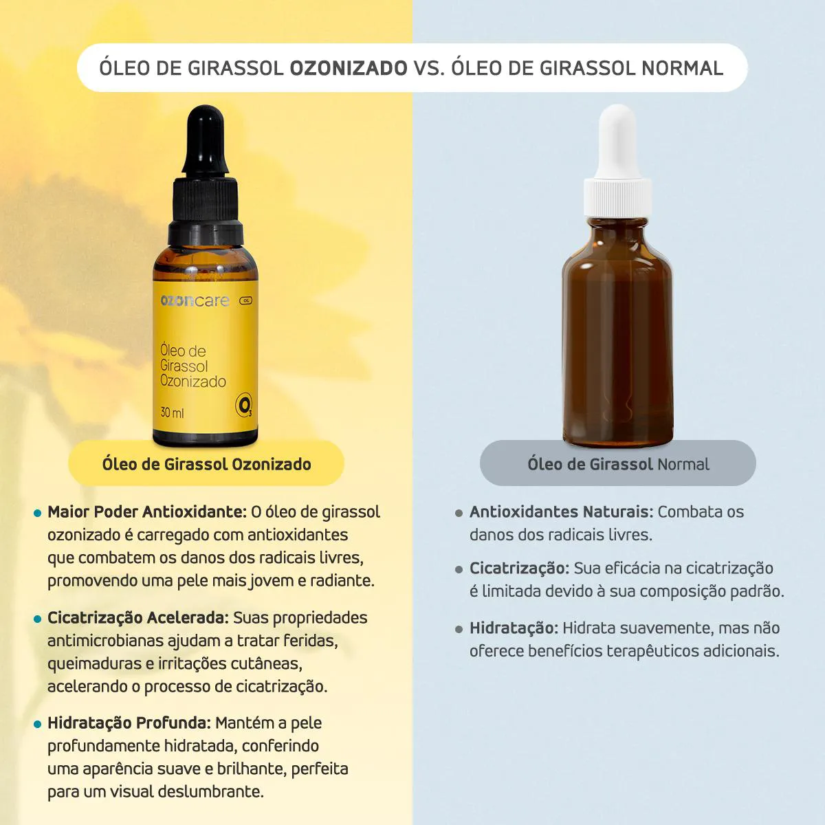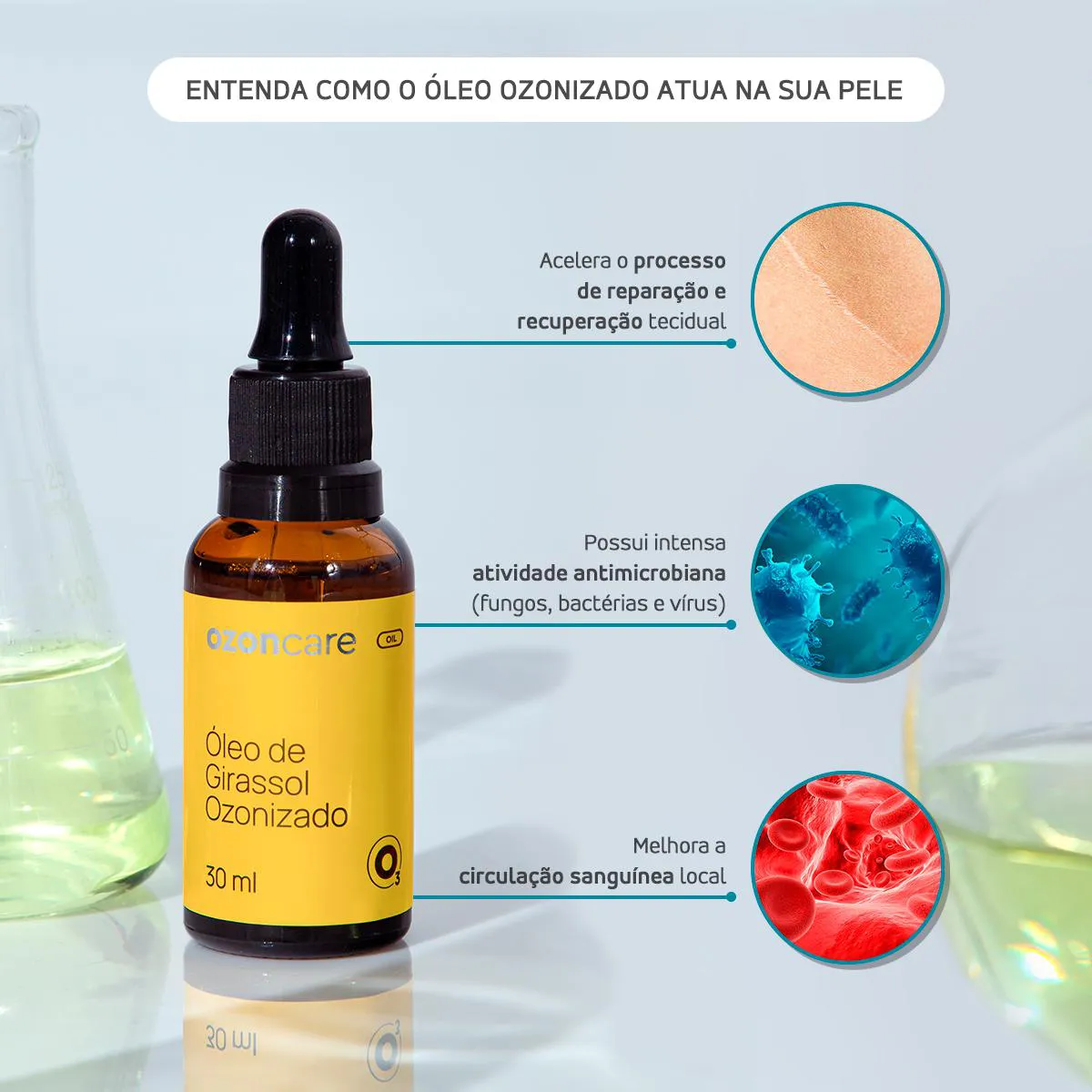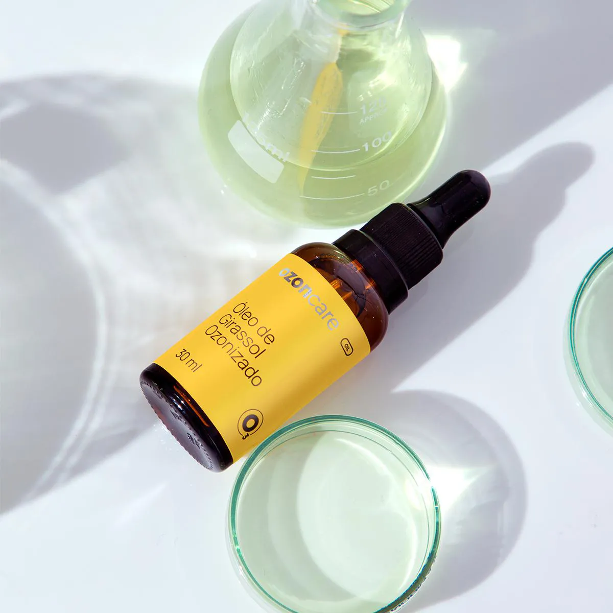 O Óleo de Girassol Ozonizado possui excelente ação antimicrobiana, cicatrizante, anti-inflamatória, além de efeitos protetores da pele. Melhora a eficiência de transporte de oxigênio no sangue e modula o estresse oxidativo.
