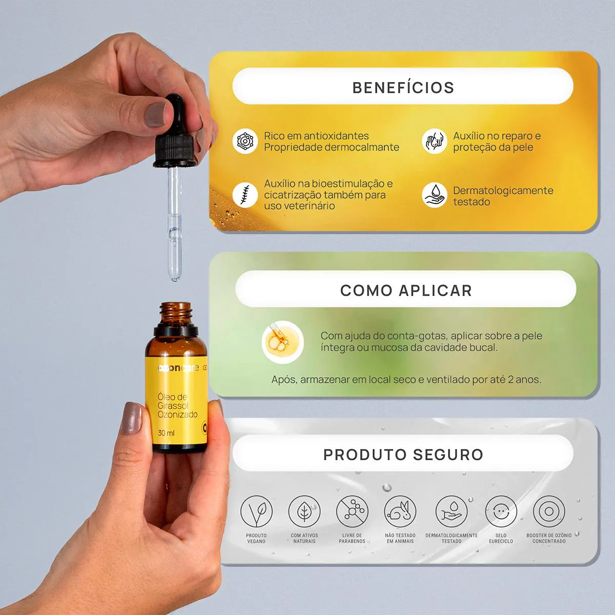 Após o processo de Ozonização, além dos benefícios naturais do óleo, são acrescidas as propriedades antimicrobianas e bioestimuladoras do Ozônio, potencializando a ação deste produto.