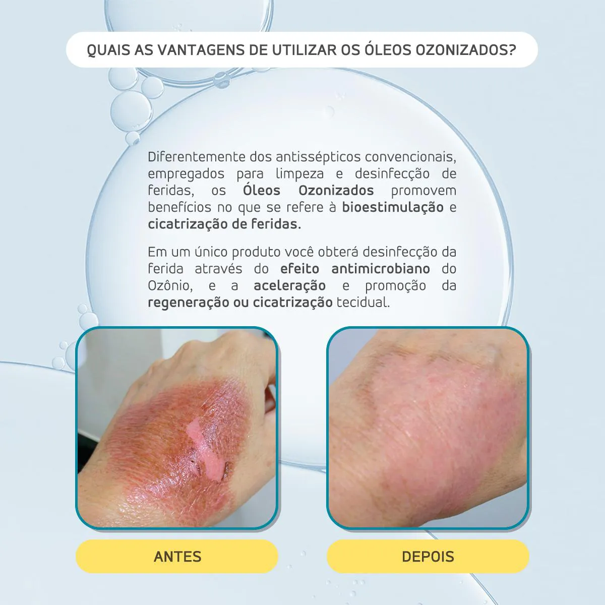 Estudos clínicos ainda demonstraram seu potencial efeito em diversas situações, como: cicatrização, micoses, úlceras, dermatites e eczemas, inflamações na pele, lesões por trauma, herpes, queimaduras, aftas, feridas, cortes, inflamações na boca e gengiva, hemorroidas e fissuras, picadas de insetos, psoríase, furúnculos, entre outras. Nosso método padronizado de fabricação dos óleos ozonizados garante estabilidade e um nível assegurado de ozonídeos para maior efetividade.