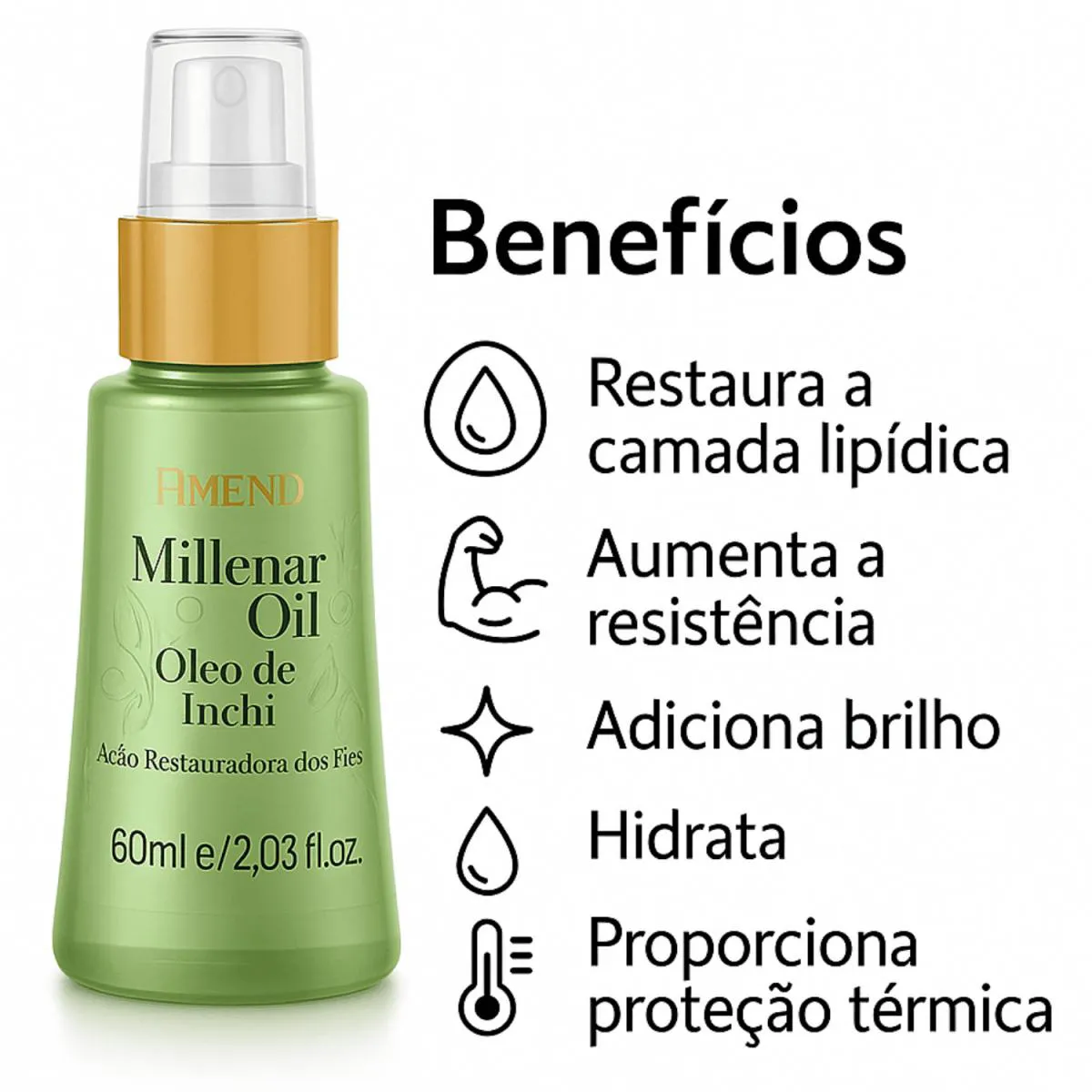 O Óleo de Inchi Amend Millenar Oil faz parte da linha Segredos do Mundo, inspirada em ingredientes milenares e altamente eficazes. Rico em nutrientes, esse óleo é extraído de uma semente usada há séculos pelos Incas nos Andes — um verdadeiro segredo ancestral de beleza capilar. Sua fórmula extranutritiva ajuda a repor a camada lipídica natural dos fios, geralmente perdida após processos químicos como alisamentos, relaxamentos e colorações. O resultado são cabelos mais resistentes, brilhantes e maleáveis, com toque sedoso e aparência saudável. Além disso, oferece proteção térmica, sendo ideal para quem utiliza secador, chapinha ou modelador de cachos. Principais benefícios: