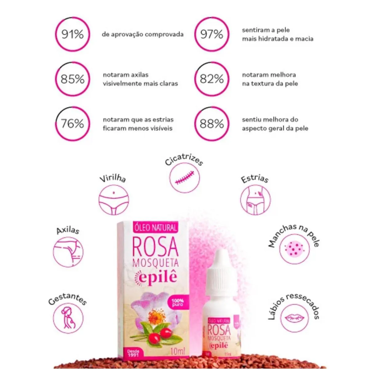 Óleo de Rosa Mosqueta 10ml – Epilê O Óleo de Rosa Mosqueta Epilê é um poderoso regenerador natural da pele, conhecido por sua ação hidratante e cicatrizante. Rico em ácidos graxos essenciais e vitaminas, auxilia na renovação celular, melhora a elasticidade da pele e ajuda a suavizar manchas, cicatrizes e linhas de expressão. Ideal para todos os tipos de pele. Diferenciais:
