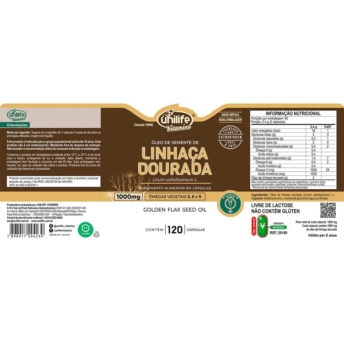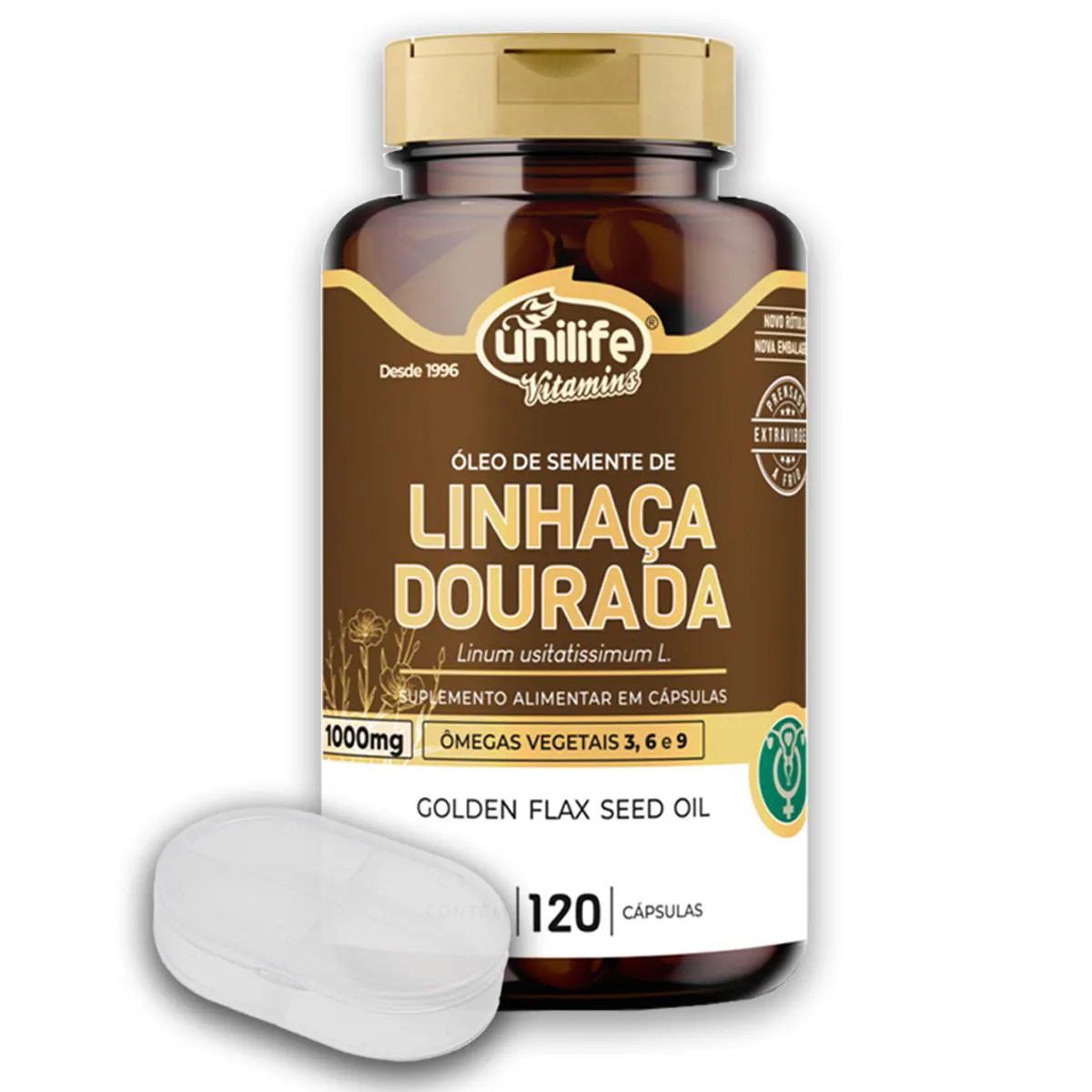Óleo de Semente de Linhaça Dourada Unilife 120 Cápsulas + Porta Cápsulas Informações sobre o produto: Suplemento alimentar em cápsulas formulado com óleo de semente de linhaça dourada (Linum usitatissimum). Embalagem com 120 cápsulas. Produto destinado a maiores de 19 anos. Como consumir: Consumir de acordo com orientação de profissional de saúde. Recomenda-se ingestão com líquidos. Ingredientes: Óleo de semente de linhaça dourada (Linum usitatissimum). Cápsula: gelatina vegetal e glicerina. Cod. Anvisa: Autorizado para comercialização conforme RDC 27/2010. AFE/MS: 6.02234-1