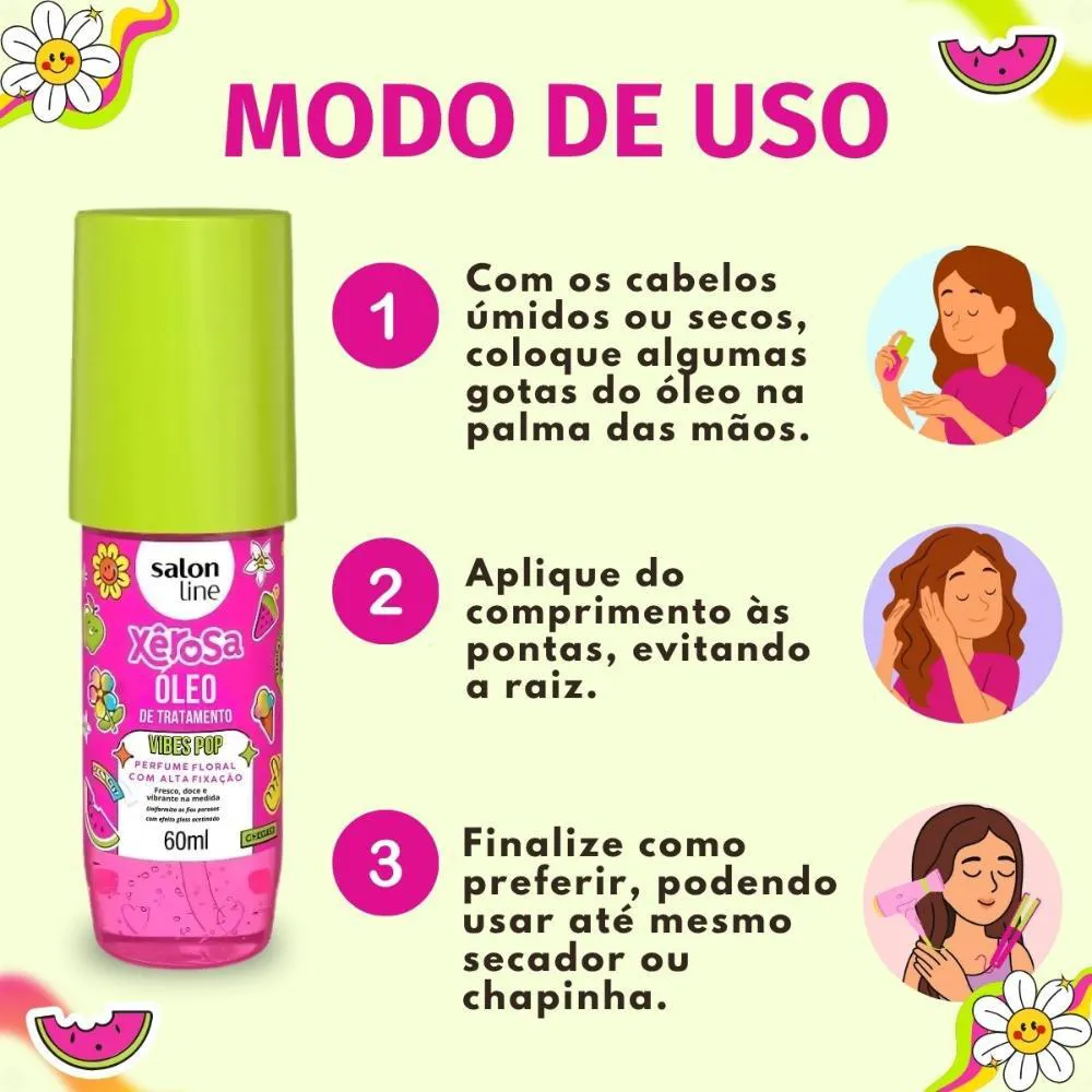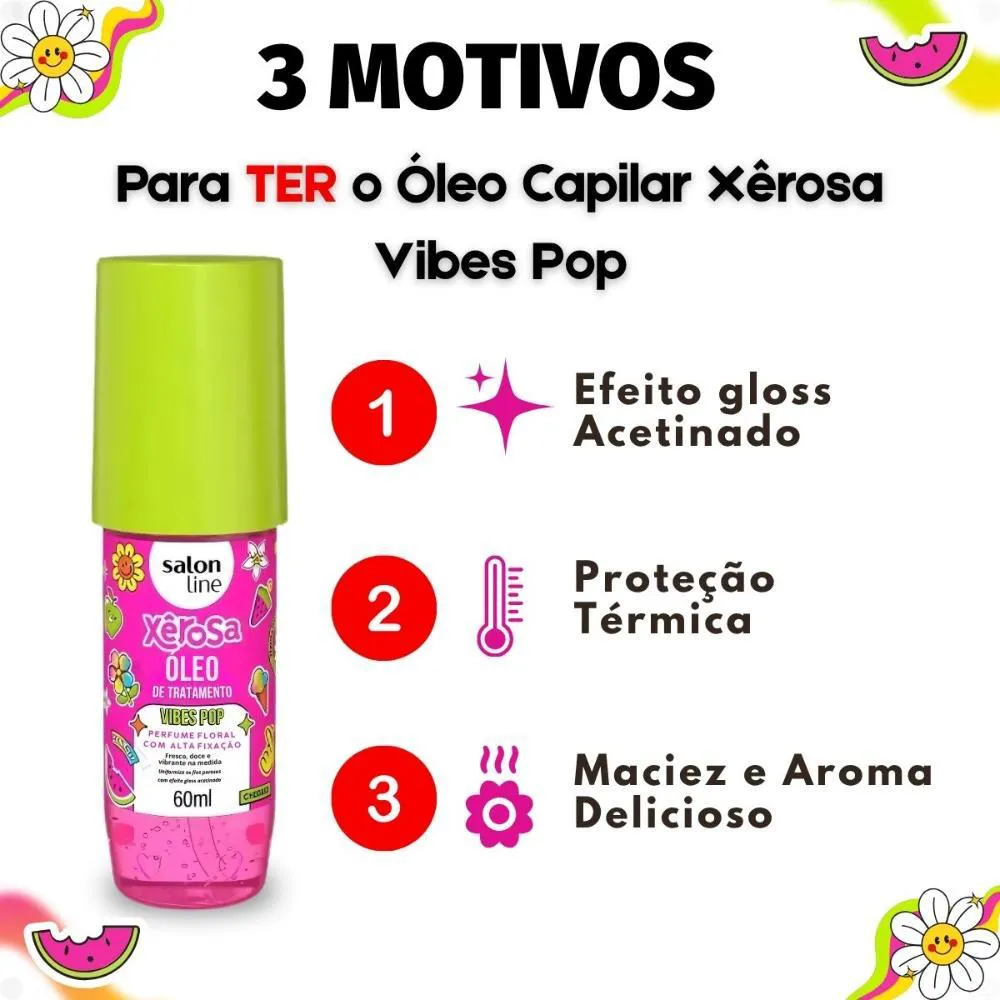 gloss acetinado e garantindo maciez e brilho intenso. Ideal para quem busca revitalizar os cabelos, este óleo oferece resultados visíveis desde a primeira aplicação.Com uma fragrância floral de alta fixação, fresca, doce e vibrante, o Óleo de Tratamento Capilar Salon Line Vibes Pop é perfeito para finalizar, nutrir e perfumar seus cabelos, elevando sua rotina de cuidados capilares a um novo nível de sofisticação e bem-estar. Indicado para mulheres e homens que desejam cabelos saudáveis, brilhantes e com um toque especial.
