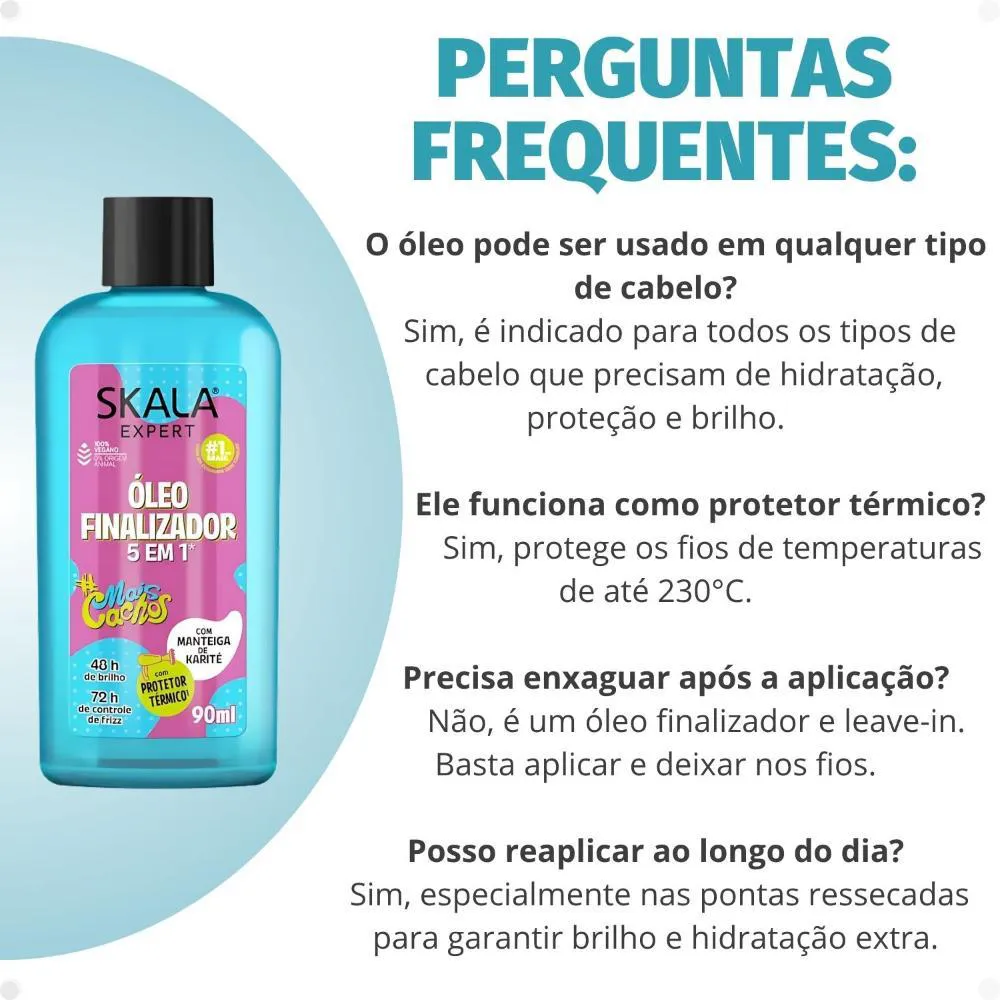 Fórmula 5 em 1, que oferece múltiplos benefícios em um só produto.Parte da linha Skala Expert Mais Cachos, desenvolvida especificamente para cabelos cacheados.Textura leve de óleo, que não pesa nos fios e facilita a aplicação.Embalagem prática de 90ml, ideal para o uso diário e para levar consigo.Ocasiões de Uso/Cenários Ideais