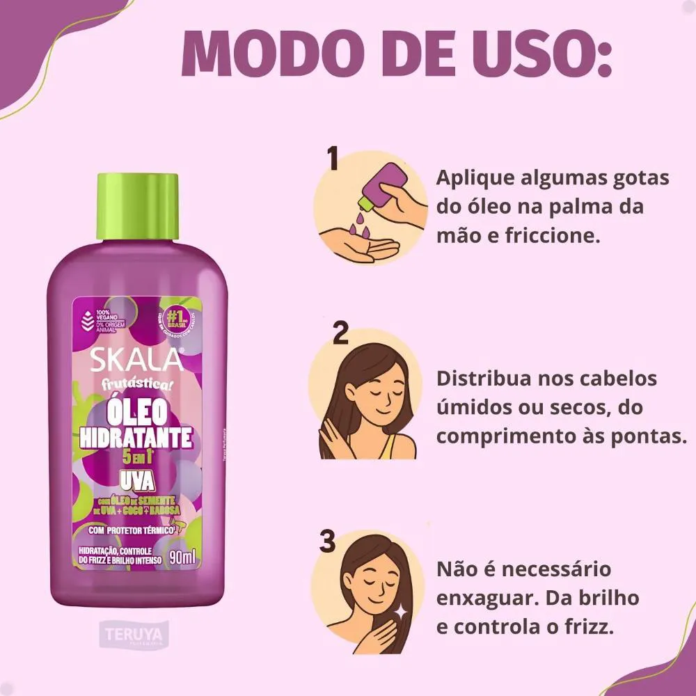 Aplicação: Aplique uma pequena quantidade do Óleo Hidratante Skala 5 em 1 Uva na palma das mãos e espalhe bem.Distribuição: Distribua uniformemente nos cabelos úmidos ou secos, do comprimento às pontas, evitando a raiz para não deixar os cabelos oleosos.Penteado: Penteie os cabelos para garantir que o produto seja distribuído de maneira homogênea e para alinhar os fios.Finalização: Não é necessário enxaguar. Use antes de ferramentas de calor para proteção térmica ou como finalizador para brilho e controle do frizz. Pode ser reaplicado ao longo do dia para umectar as pontas ressecadas.