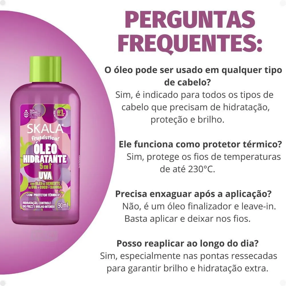 Descubra o poder do Óleo Hidratante Skala 5 em 1 Uva Com Protetor Térmico 90ml, a solução ideal para quem busca cabelos nutridos, protegidos e com brilho intenso. Desenvolvido pela renomada marca SKALA, este óleo capilar multifuncional oferece uma experiência completa de cuidado, combinando hidratação profunda com a defesa essencial contra danos externos. Perfeito para todos os tipos de cabelo, ele se torna um aliado indispensável na sua rotina de beleza, garantindo fios saudáveis e radiantes. Ideal para quem busca praticidade e resultados visíveis, este óleo proporciona um tratamento completo em um único produto.