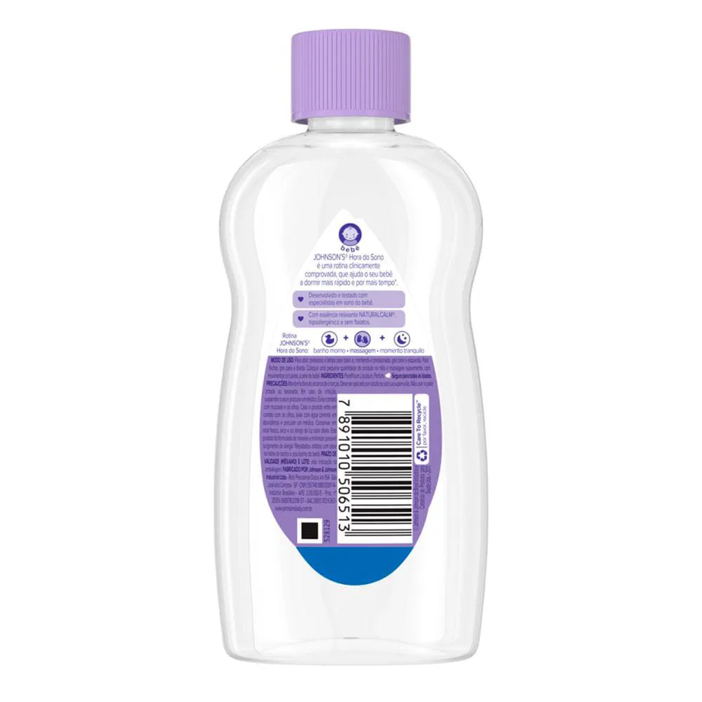 O Óleo Johnson's Baby Hora do Sono foi desenvolvido como parte de uma rotina que ajuda o seu bebê a dormir mais rápido, melhor e por mais tempo durante a noite; ideal para ser usado antes do bebê dormir, após o banho com água morna. Com tripla proteção. Sem adição de corantes, álcool etílico, conservantes doadores de formaldeído. Dermatologicamente testado e hipoalergênico