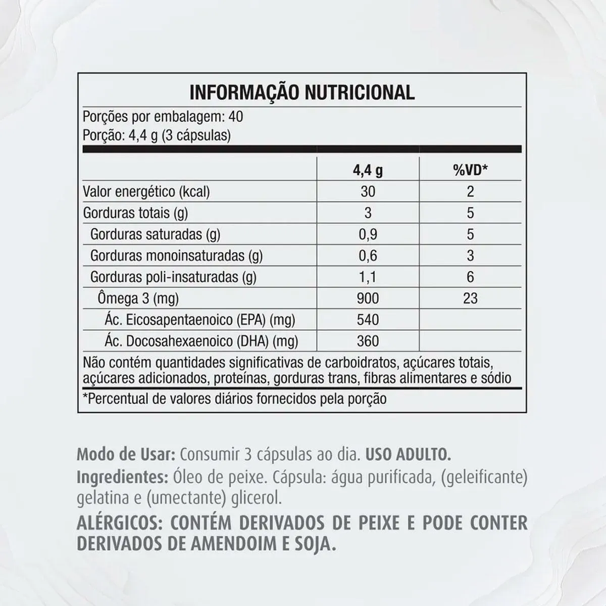 Contém 540mg de EPA e 360mg de DHA por porção (3 cápsulas).
