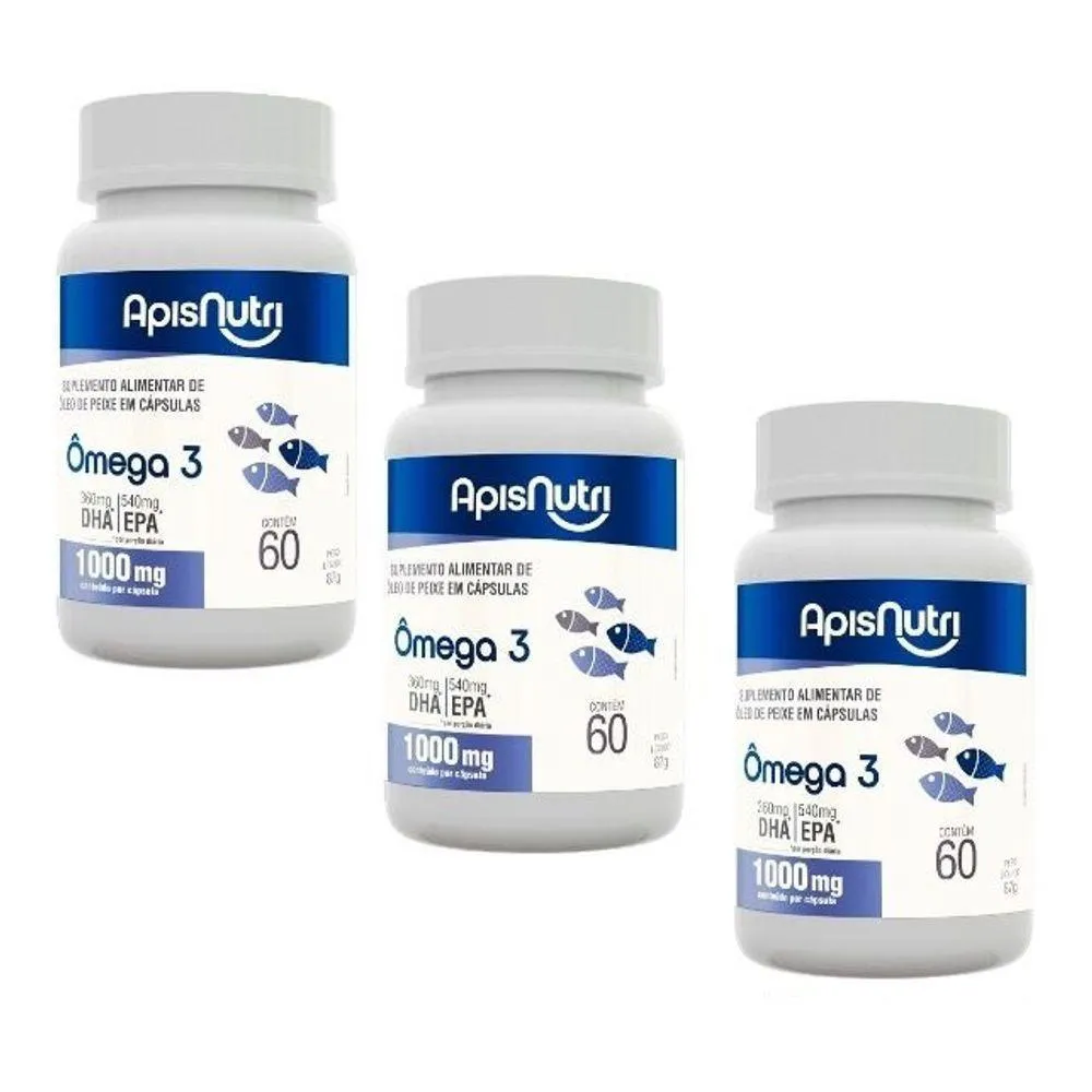 ÓLEO DE PEIXE ÔMEGA 3 1000mg (60 caps) - APISNUTRI O Ômega 3, óleo de peixe da Apisnutri é um suplemento a base de óleo de salmão, rico em ômega 3. É um produto totalmente natural, capaz de proporcionar incríveis benefícios a sua dieta. O Ômega 3 é encontrado em abundância em peixes frios. No Brasil, o único que encontramos é o salmão em cativeiro, ou seja, não é a mesma quantidade que encontramos em águas geladas. A Apisnutri utiliza o óleo de salmão importado em sua composição, trazendo a quantidade encontrada em peixe de águas frias, o que é a ideal para uma melhor qualidade de vida. BENEFÍCIOS * Ajuda no emagrecimento;* Melhora a qualidade do sistema imunológico;* Possui propriedades anti-inflamatórias naturais;* Ajuda na prevenção e combate a depressão e ansiedade;* Tem ação anti-inflamatória;* Contribui para uma pele saudável;* Auxilia no controle da pressão arterial;* Possui efeito antitrombótico;* Promove a saúde cardiovascular;* Protege a retina;* Melhora o desempenho cognitivo. Embalagem disponível: frasco contendo 60 cápsulas.