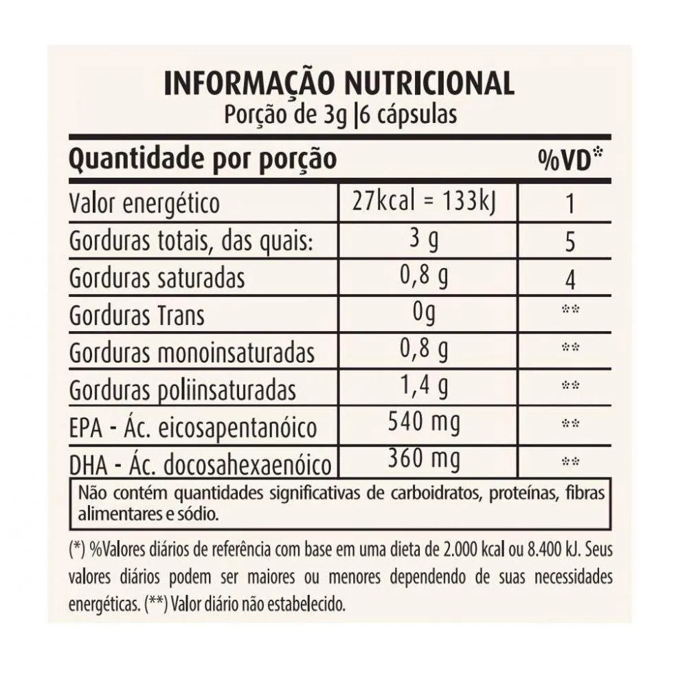 Informação Nutricional Ômega 3 500mg (60 caps) - APISNUTRIPorção de 3g (06 cápsulas)Quantidade por porção%VD(*)Valor energético27kcal=113kJ1Gorduras Totais, 3g5Gorduras Saturadas0,8g4Gorduras monoinsaturadas0,6g**Gorduras poliinsaturadas1,1g**EPA (ácido eicosapentanóico540mg**DHA (ácido docosalhexaenóico) 360mg**Não contém quantidades significativas de carboidratos, proteínas, fibra alimentar e sódio.* % Valores Diários com base em uma dieta de 2.000Kcal ou 8400kJ. Seus valores diários podem ser maiores ou menores dependendo das suas necessidades energéticas. Obs: Pode haver pequenas variações na informação nutricional, conforme o sabor.