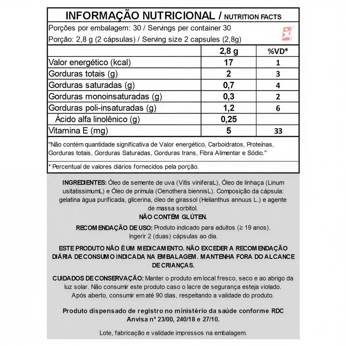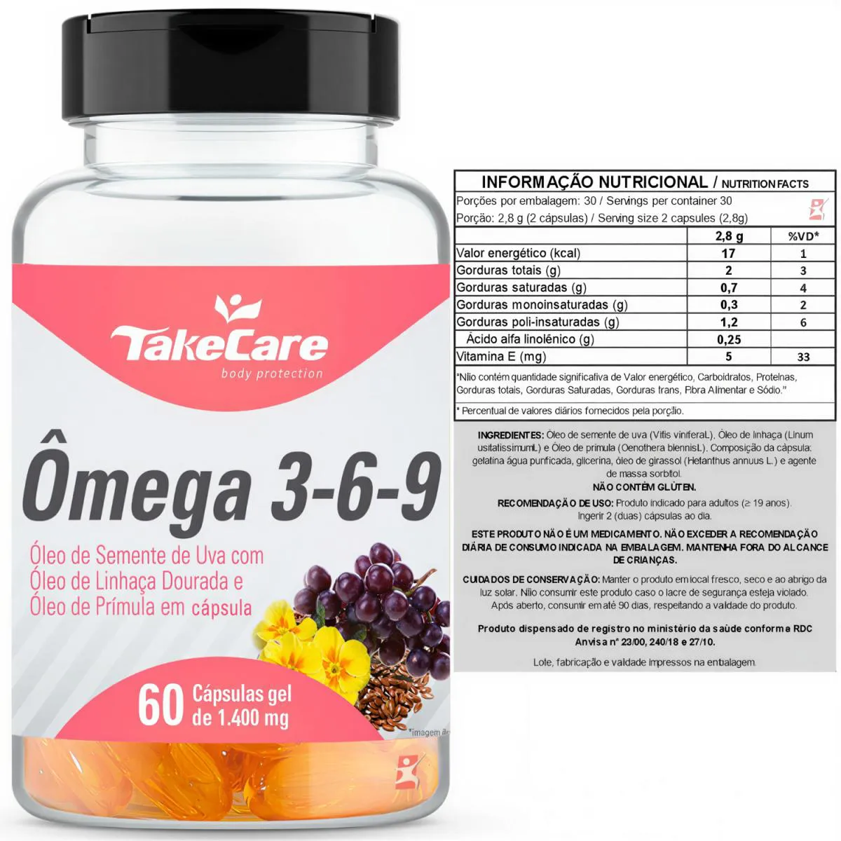 TABELA NUTRICIONAL - COMPOSIÇÃO e RECOMENDAÇÕES Anexo nas imagens. DADOS TÉCNICOS Registro ANVISA – Produto dispensado de registro no Ministério da saúde conforme RDC ANVISA nº23/00, 240/18 e 27/10. Marca – Take Care. Conteúdo líquido total – 60 cápsulas. Rendimento líquido total – 30 doses/porções. Peso líquido total – 84g. Peso bruto total – 111g. Peso aproximado produto + embalagem (aproximado) – 150g. Código de barras (EAN) – 7898411817620. Dimensões do produto – largura: 6cm; altura: 11cm; comprimento: 4,5cm. Dimensões da embalagem/pacote – largura: 13cm; altura: 7cm; comprimento: 16cm. ITENS DO ANÚNCIO 1 Unidade do produto: ÔMEGA 3-6-9 ÓLEO DE SEMENTE DE UVA, ÓLEO DE LINHAÇA, ÓLEO DE PRÍMULA 60 CÁPSULAS – TAKE CARE. Total – 60 Cápsulas POR FRASCO.