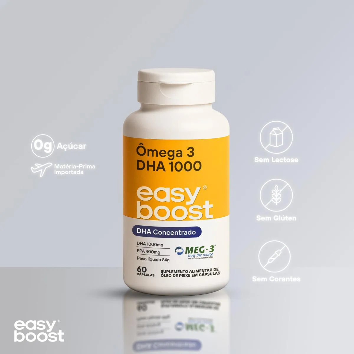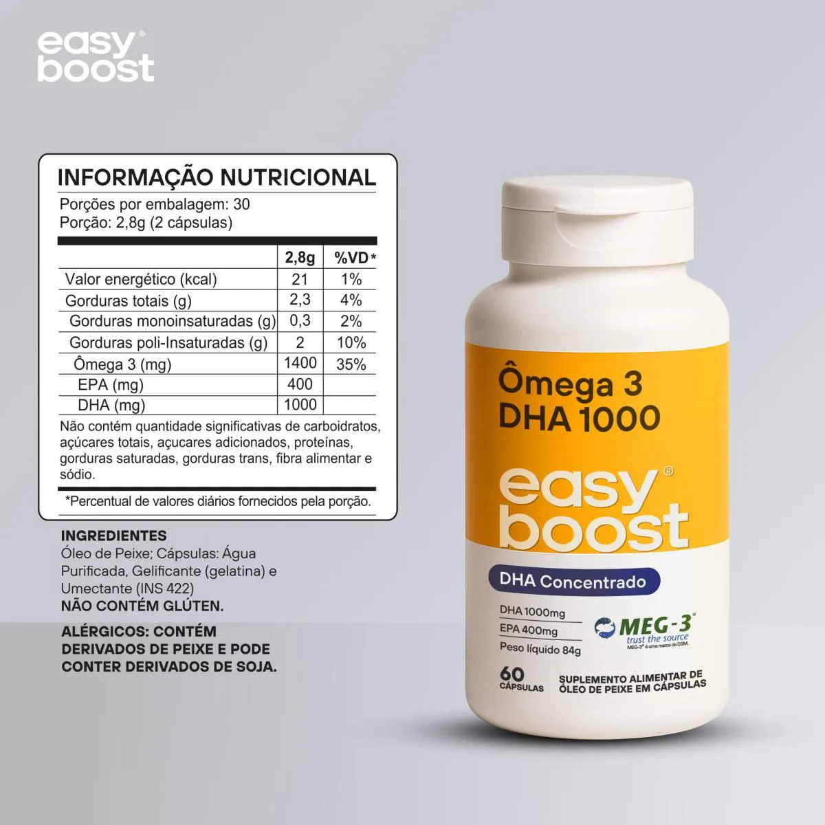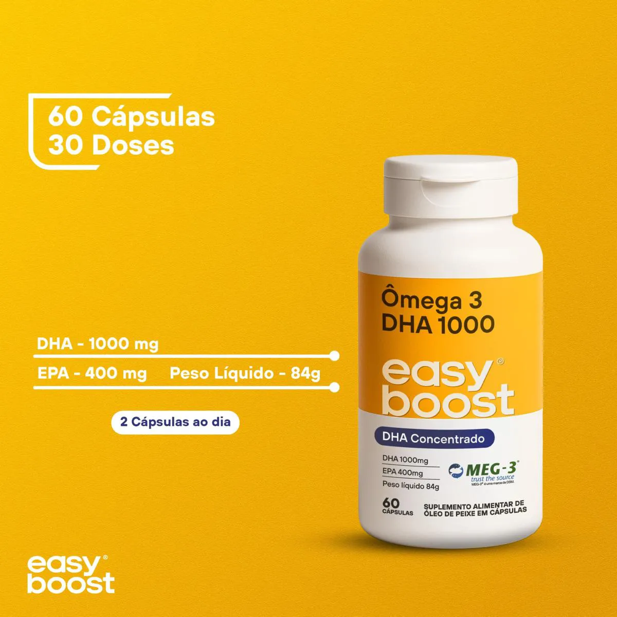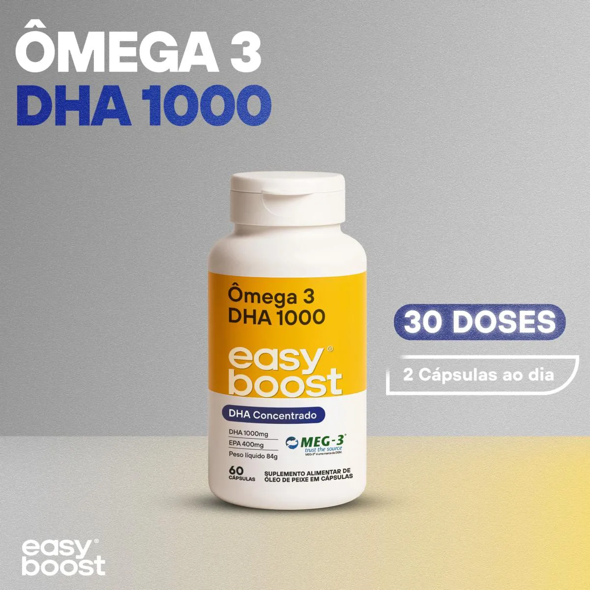 Neste anúncio você irá adquirir 1 frasco de Ômega 3 DHA 1000 Easy Boost com 60 cápsulas com uma validade longa, de no mínimo 12 meses. Conheça a Easy Boost: Somos a Easy Boost, uma marca apaixonada por saúde, vitalidade e criatividade. Inspirados pela juventude e inovação, criamos suplementos alimentares de alta qualidade, projetados para impulsionar seu estilo de vida ativo. Nossa identidade é jovem, vibrante e reflete a energia positiva que buscamos instigar em cada aspecto da sua jornada de bem-estar. Somos mais do que uma marca de suplementos alimentares; somos seus parceiros na busca por uma versão mais energizada e confiante de si mesmo. Informação Nutricional: 30 porções Porção de 2,8g Ômega 3 - 1400mg 35% VD EPA - 400mg DHA 1000mg Não contém quantidades significativas de valor energético, carboidratos, açúcares totais, proteínas, gorduras totais, gorduras saturadas, gorduras trans, fibra alimentar e sódio. Ingredientes: Óleo de Peixe. NÃO CONTÉM GLÚTEN. Uma nutrição equilibrada tem um papel muito importante na qualidade de vida. Com o ritmo acelerado de muitas pessoas, às vezes, é muito difícil prestar atenção a todos os requisitos que o corpo precisa para estar saudável e forte. Neste sentido, os suplementos cumprem a função de complementar a alimentação e ajudam a obter as vitaminas, minerais, proteínas e outros componentes indispensáveis para o correto funcionamento do organismo. *Este produto é um suplemento dietético, não é um medicamento. Suplementa Ante dietas insuficientes. Consulte seu médico e / ou farmacêutico. Aviso legal Idade mínima recomendada: 19 anos. Consumir junto com alimentos para facilitar sua assimilação. Este produto é um suplemento dietético, não um medicamento. Suplementa dietas insuficientes. Consulte o seu médico e/ou farmacêutico.