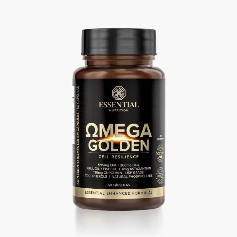 O Ômega Golden é um suplemento da Essential Nutrition que combina óleo de peixe em triglicerídeos (TG) e óleo de krill em fosfolipídeos, com compostos antioxidantes como curcumina (USP Grade), astaxantina e vitamina e. Cada porção fornece 595 mg de EPA e 260 mg de DHA, além de ingredientes que atuam de forma sinérgica, potencializando a estabilidade e eficiência da fórmula.