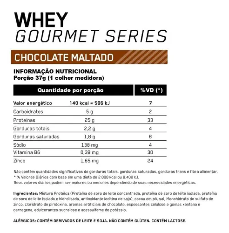 Mistura proteica (proteína de soro de leite concentrada, proteína de soro de leite isolada, proteína de soro de leite isolada e hidrolisada, emulsificante lecitina de soja), baunilha/chocolate em pó, sal, sulfato de zinco, cloridrato de piridoxina, aromas artificiais de baunilha, espessantes (celulose, goma xantana e goma carragena) e edulcorantes (sucralose e acessulfame de potássio).
