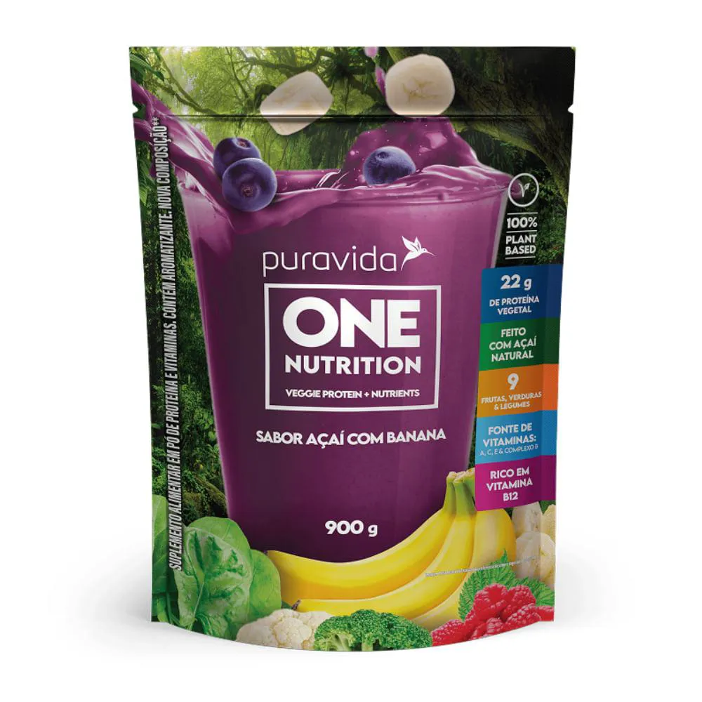 O One Nutrition sabor açaí com banana Puravida é um suplemento alimentar 100% vegetal que combina proteínas vegetais, vitaminas e o poder nutritivo de frutas, verduras e legumes em uma fórmula prática e saborosa. Elaborado com açaí natural, reúne o sabor equilibrado da banana e uma seleção de 9 frutas, verduras e legumes, oferecendo nutrição concentrada para o dia a dia.Com 22 g de proteína vegetal por porção, o ele é adoçado com adoçantes naturais, sem adição de açúcar. Livre de maltodextrina, soja e lácteos, apresenta textura suave e excelente solubilidade, proporcionando uma experiência agradável ao paladar.