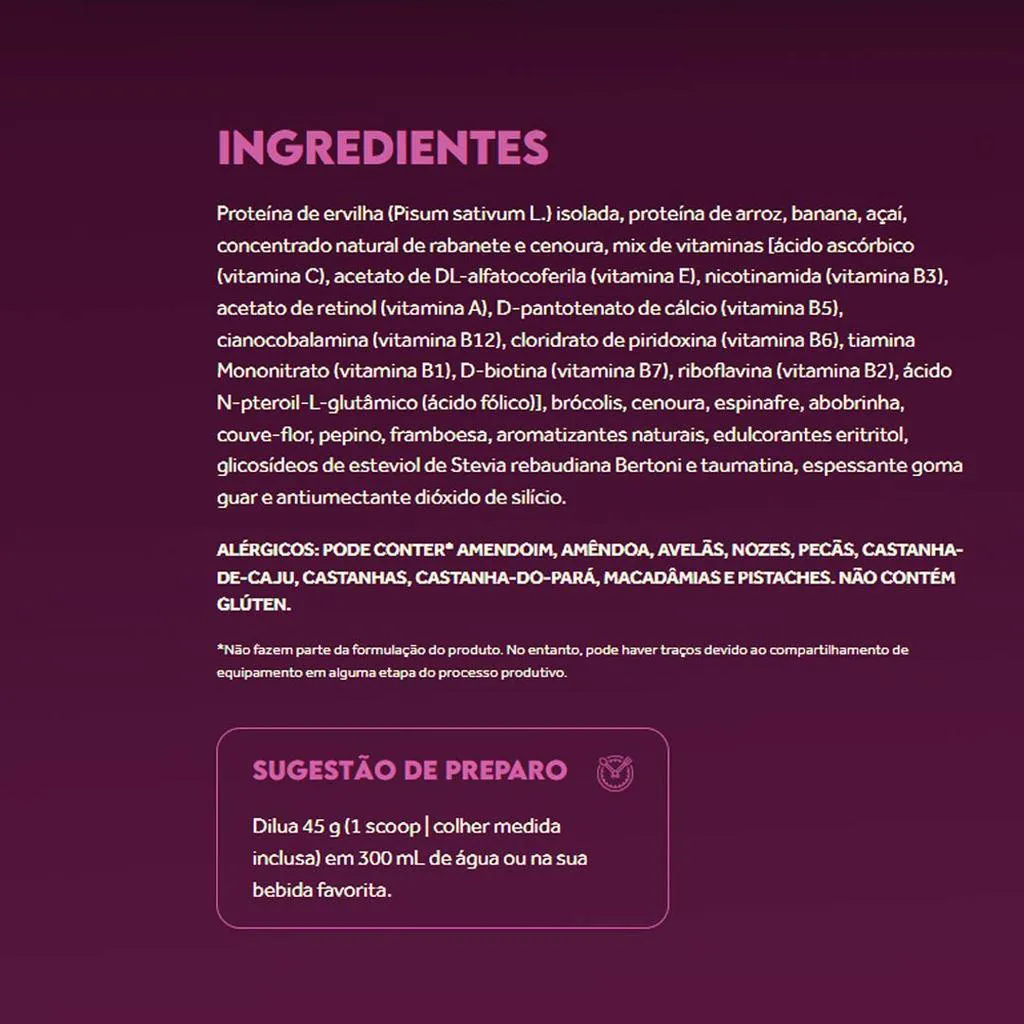 Diluir a porção recomendada em água, bebida vegetal ou adicionar em vitaminas e smoothies. Também pode ser utilizado em receitas como panquecas, mingaus e bowls proteicos.Indicado para: