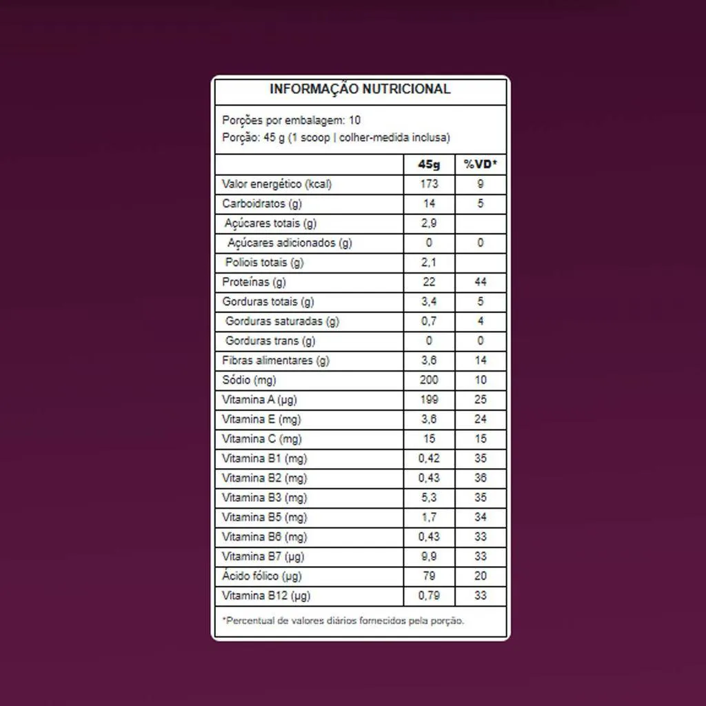 Proteína 100% vegetalIdeal para veganos, vegetarianos ou para quem deseja reduzir o consumo de proteínas de origem animal. Auxilia na manutenção muscular