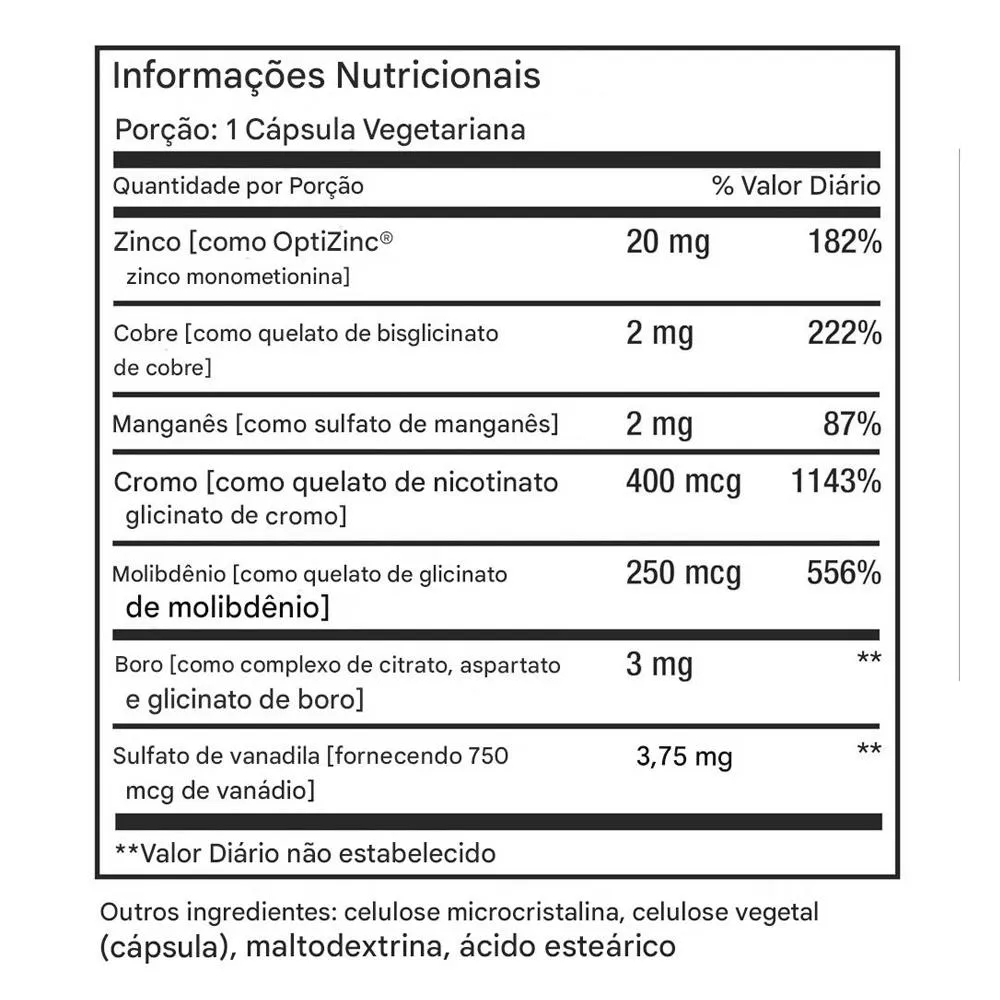 Minerais traço são fundamentais para diversas funções do corpo. Esse suplemento permite complementar a ingestão diária de forma prática, contribuindo para manter níveis adequados de nutrientes essenciais na rotina.