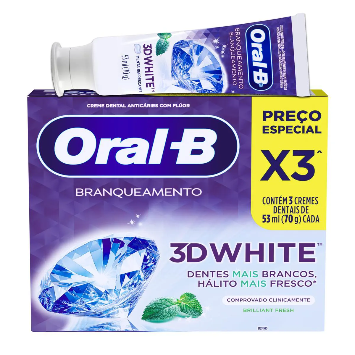 O Kit Pasta de Dente Oral-B 3D White Branqueamento é um conjunto de 3 unidades de creme dental com sistema de micropérolas, desenvolvido para higiene bucal diária. Serve para remover manchas superficiais dos dentes, limpar áreas de difícil acesso, prevenir cárie e placa bacteriana, além de proporcionar hálito refrescante. Sua fórmula permite uso diário sem danificar o esmalte dentário, ajudando a clarear os dentes em até 2 semanas.