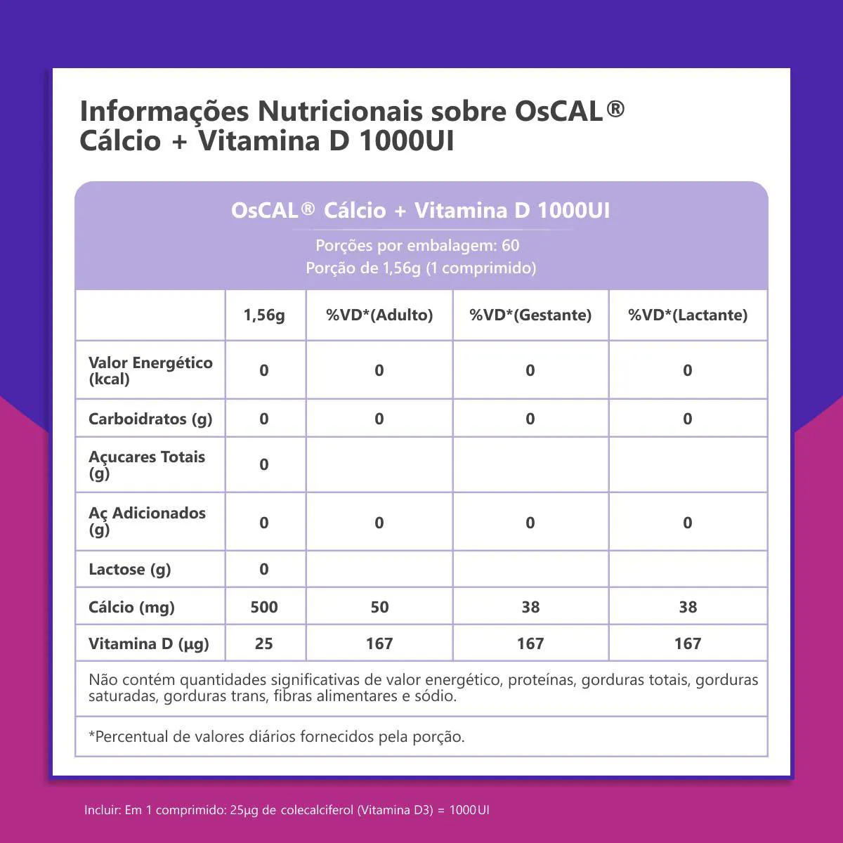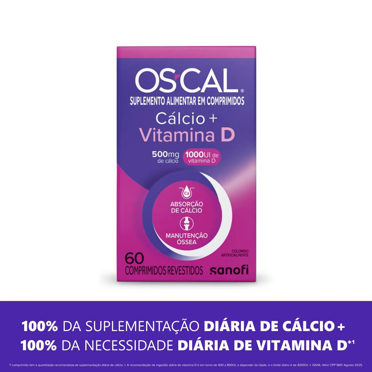 O Oscal D é um suplemento alimentar de cálcio e vitamina D indicado para auxiliar na formação e manutenção da saúde dos dentes e ossos. É especialmente recomendado para prevenção ou tratamento auxiliar da desmineralização óssea em mulheres no período pré e pós-menopausa.