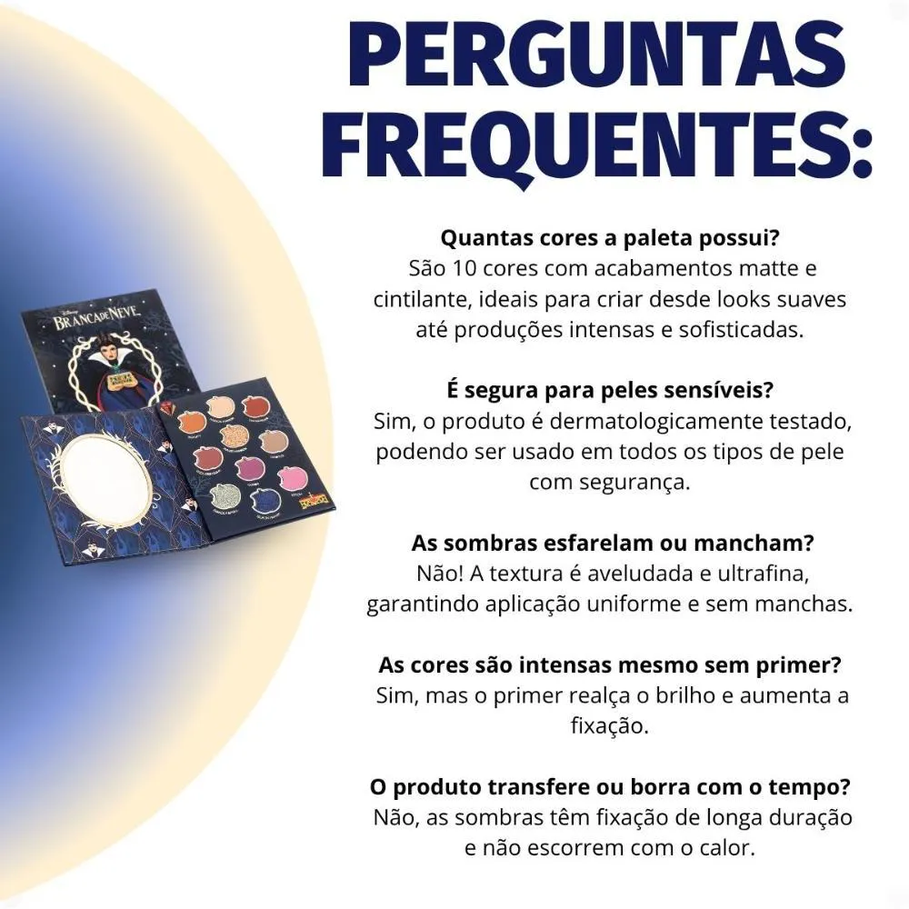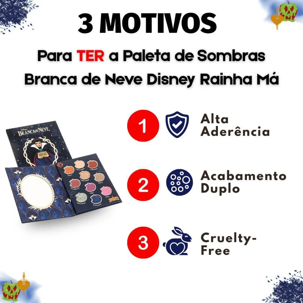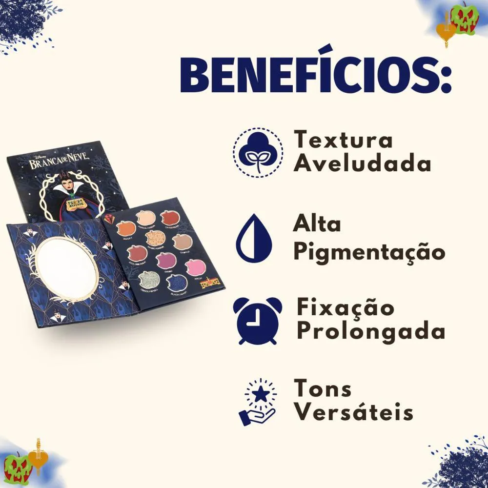 - Produto licenciado Disney Branca de Neve, perfeito para colecionadores e fãs. - Fórmula dermatologicamente testada, garantindo segurança para sua pele. - Compromisso com a ética: produto não testado em animais. - Versatilidade de acabamentos com sombras matte e brilhantes em uma única paleta.Ocasiões de Uso/Cenários Ideais: