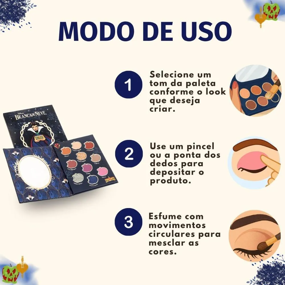 A Paleta De Sombras Fenzza Disney Branca De Neve é perfeita para o uso diário, permitindo criar maquiagens discretas para o trabalho ou escola. É também ideal para ocasiões especiais, festas temáticas ou para quem busca expressar sua criatividade com looks mais ousados e coloridos.Modo de Uso/Aplicação: