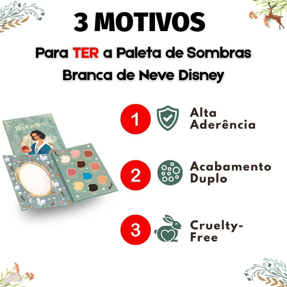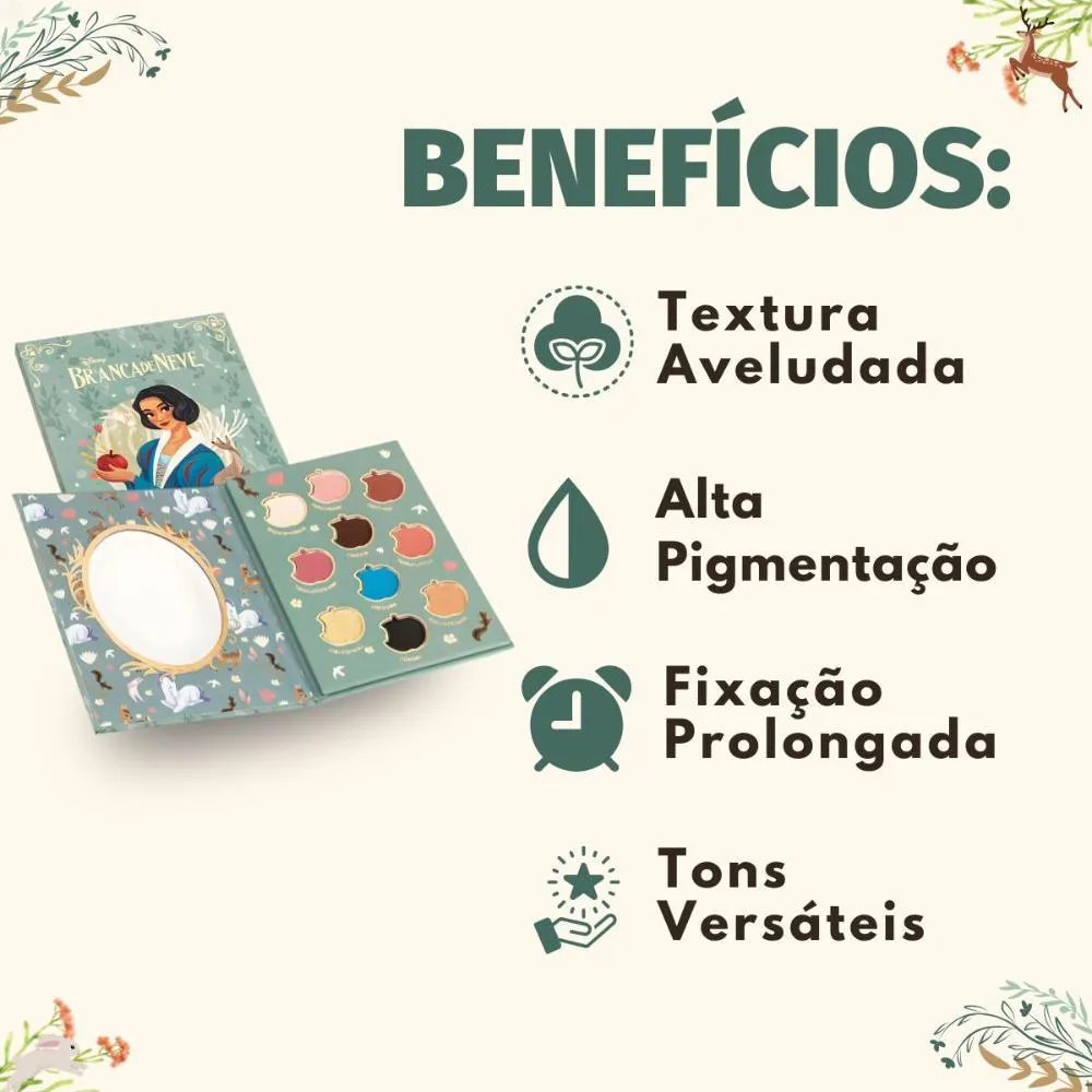 - Design exclusivo Disney Branca de Neve: uma peça de colecionador para os fãs da Disney. - Fórmula de alta qualidade Fenzza Makeup: garantia de cores vibrantes e longa duração. - Versatilidade de uso: ideal para criar looks desde os mais básicos até os mais elaborados. - Produto com 6,2g: excelente custo-benefício, proporcionando muitas aplicações. - Livre de parabenos: uma opção mais saudável e segura para a sua pele.Ocasiões de Uso/Cenários Ideais