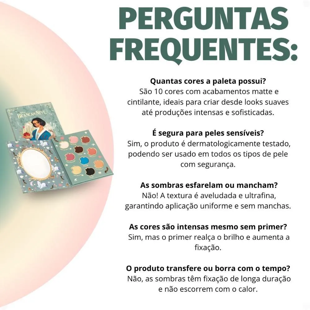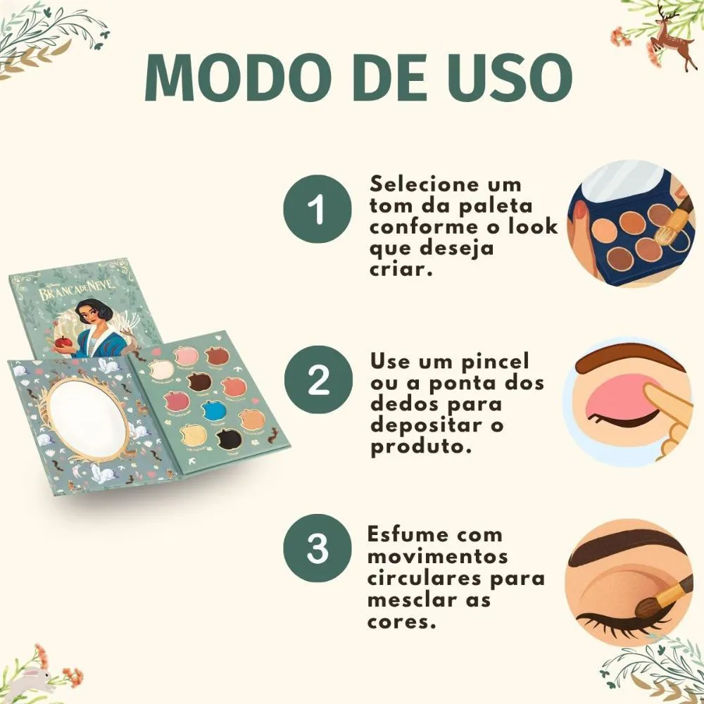 A Paleta De Sombras Fenzza Disney Branca De Neve é perfeita para diversas ocasiões: desde o dia a dia, adicionando um toque de cor e alegria, até eventos especiais como festas temáticas, encontros com amigos e celebrações. Ideal para quem ama maquiagem e quer expressar sua personalidade de forma criativa e divertida. Use-a para criar looks incríveis em festas à fantasia, eventos cosplay ou simplesmente para se sentir mais confiante e radiante no seu dia a dia.Modo de Uso/Aplicação