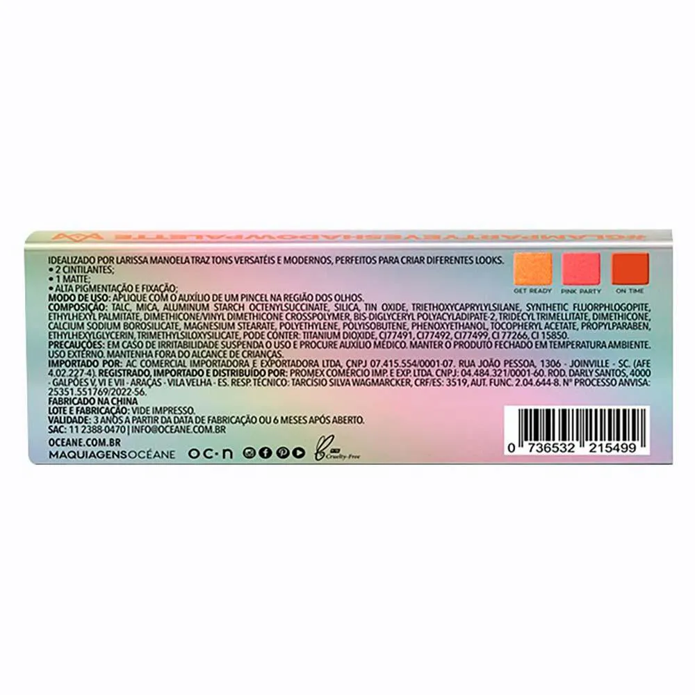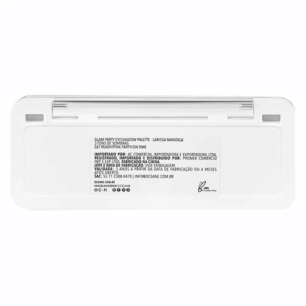 A Paleta de sombras Glam Party Larissa Manoela by Océane é compacta e perfeita para te acompanhar sempre na bolsa, possui 3 cores fáceis de combinar, com muita pigmentação e fixação.
