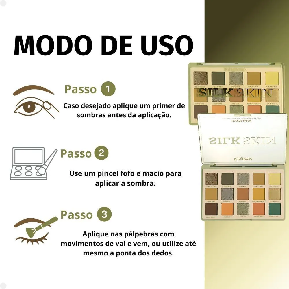 Paleta de sombras Ruby Rose Silk Skin Nature Gleam Hb-e2205 A Paleta Silk Skin Nature Gleam da Ruby Rose oferece cores intensas, versáteis e fáceis de esfumar. Com texturas aveludadas e alta pigmentação, ela é perfeita para criar desde looks leves e naturais até produções mais marcantes e glamourosas. Combinando tons matte, cintilantes e metálicos, é ideal para realçar sua beleza em qualquer ocasião! . Matte -Contém 10 unidades -Tonalidades: 02-Olive Groove, 04-Florest Floor, 05-Mint Meadow, 06-Spring Fern, 08-Pine Bark, 09-Heritage Mustard, 11-Rustic Earth, 12-Amber Dust, 14-Autumn Leaf, 15-Emerald Twist. Cintilante -Contém 05 unidades -Tonalidades: 01-Bronze Forest, 03-Sage Green, 07-Wildwood, 10- Golden Fern, 13-Lime Glow. . Modo de Uso Aplique as sombras como desejar com um pincel ou com a ponta dos dedos, aplique nas pálpebras com movimentos de vai e vem. Composição Sombra Matte: Dimethicone, Mica, Talc, Silica, Kaolin, Magnesium Stearate, Ethylhexyl Palmitate, Tridecyl Trimellitate, Simethicone, Boron Nitride, Bis-Diglyceryl Polyacyladipate-2, Triacontanyl PVP, Hydrogenated Polyisobutene, Magnesium Myristate, Parfum, Phenoxyethanol, Tocopheryl Acetate. Sombra Cintilante: Synthetic Florphlogopite, Ethylhexyl Palmitate, Dimethicone, Tridecyl Trimellitate, Isononyl Isononanoate, Magnesium Stearate, Petrolatum, Mica, Polyisbutene, Cyclopentasiloxane, Parfum, Phenoxyethanol, Tin Oxide. . Perguntas Frequentes: As sombras transferem com facilidade? Não. Elas têm boa fixação na pele, principalmente quando aplicadas sobre primer. É fácil de construir camadas (intensificar a cor)? Sim! A fórmula permite criar camadas para um efeito mais suave ou mais marcante. A paleta marca linhas finas da pálpebra? Não. As sombras têm textura fina e aveludada, que adere bem sem acumular nas linhas. Preciso usar primer antes? Não é obrigatório, mas o primer para olhos potencializa a cor e aumenta a durabilidade das sombras. Os brilhos cintilantes esfarelam? Não. As sombras cintilantes são finas e aderem bem à pele, principalmente se aplicadas pressionando com o dedo ou pincel umedecido. . Código de Registro Sanitário (ANVISA) Matte: 25351.449456/2024-09 Cintilante: 25351.449455/2024-56