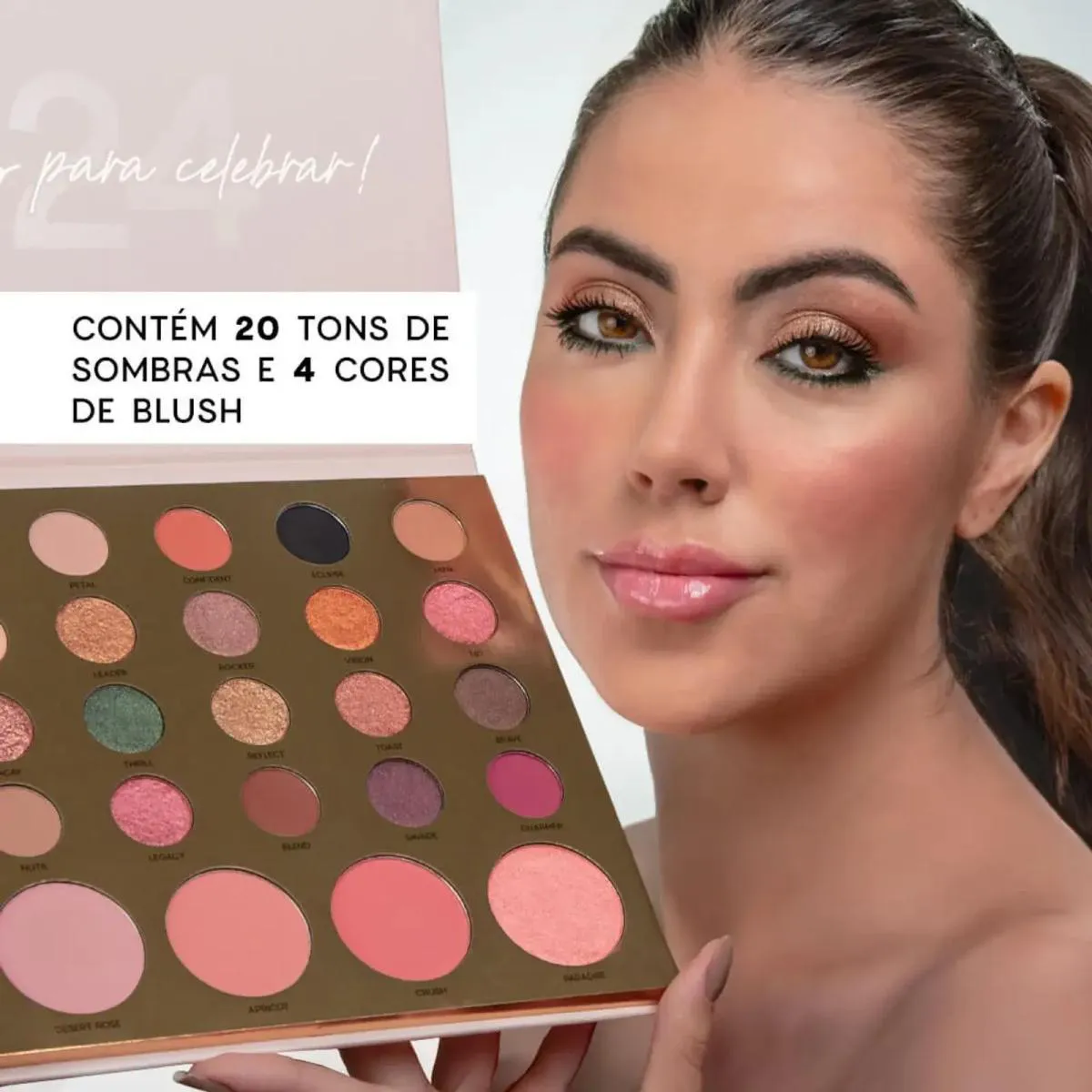 Paleta multifuncional. Océane Celebrate, versátil e prática, é uma verdadeira festa de cores para você usar a criatividade! A Paleta Multifuncional Océane Celebrate vai te acompanhar em qualquer celebração, das mais casuais às mais elegantes e formais. Ela vem com 20 tons de sombras com diferentes texturas e acabamentos e 4 tons de blush com acabamento cintilante e matte. Sendo assim, se adapta aos diversos tipos de pele, estilos e looks. Dos tons mais neutros aos mais vibrantes, o que todos tem em comum é a alta durabilidade e acabamento super profissional. Experimente, use e abuse sem medo! Modo de usar: Sombras: passe o pincel de sombra sobre a cor desejada e aplique diretamente nas pálpebras até atingir o resultado desejado. Blushes: passe o pincel sobre a cor desejada, dê leves batidinhas para retirar o excesso e aplique nas maçãs do rosto.