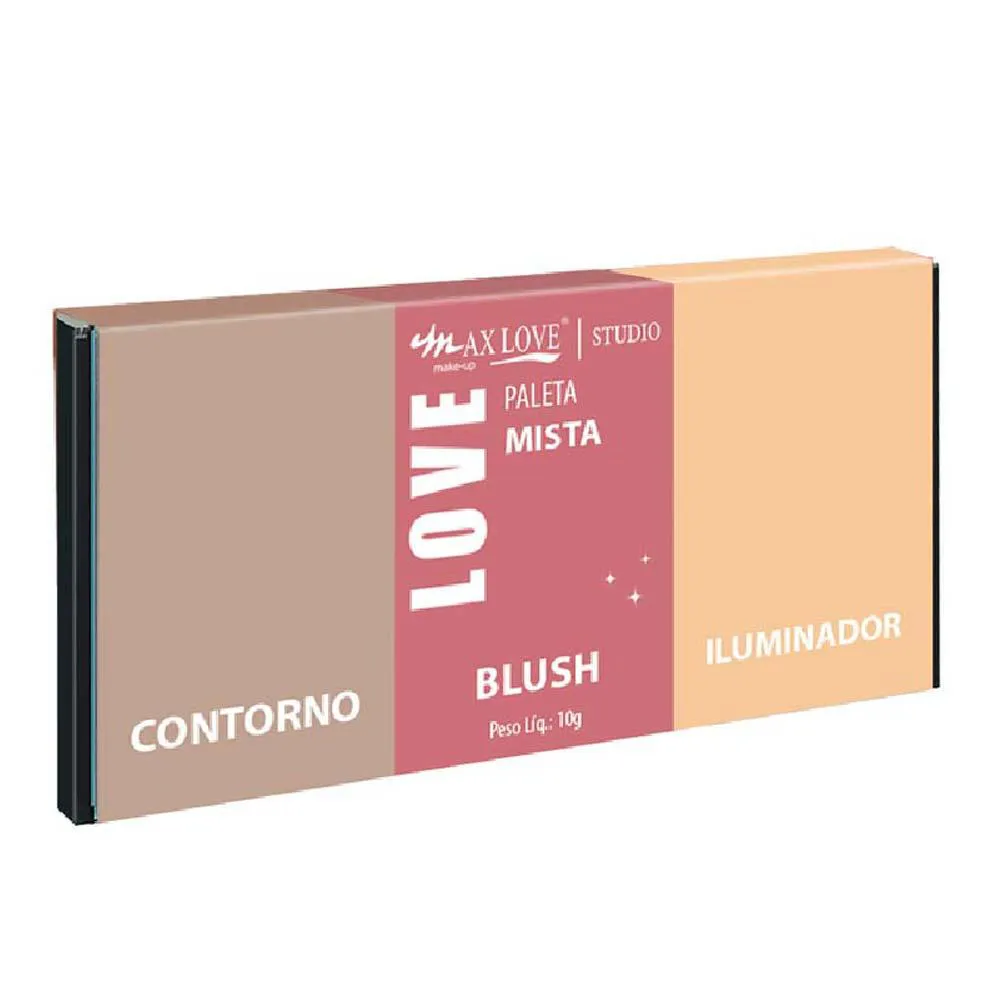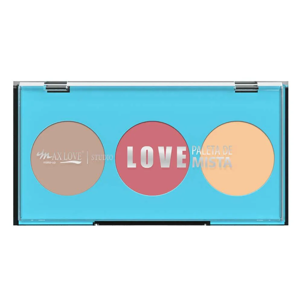 A Paleta Mista Max Love é um trio contendo uma tonalidade de contorno, uma de blush e uma de iluminador, para criar efeitos de sombreamento e destaque nas áreas do rosto.