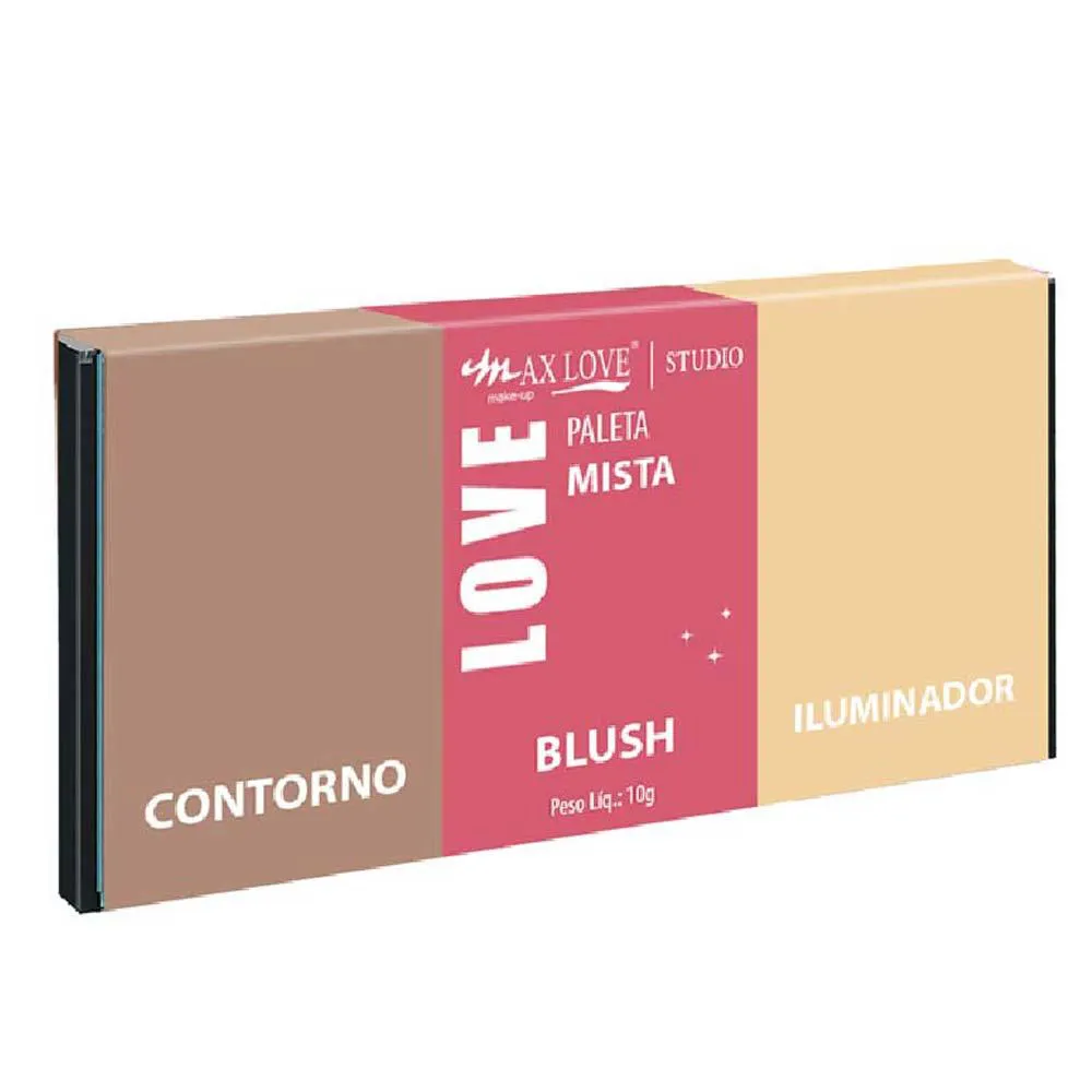 A Paleta Mista Max Love é um trio contendo uma tonalidade de contorno, uma de blush e uma de iluminador, para criar efeitos de sombreamento e destaque nas áreas do rosto.
