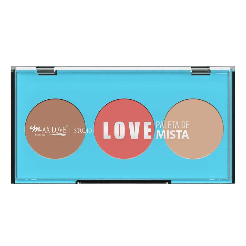 A Paleta Mista Max Love é um trio contendo uma tonalidade de contorno, uma de blush e uma de iluminador, para criar efeitos de sombreamento e destaque nas áreas do rosto.