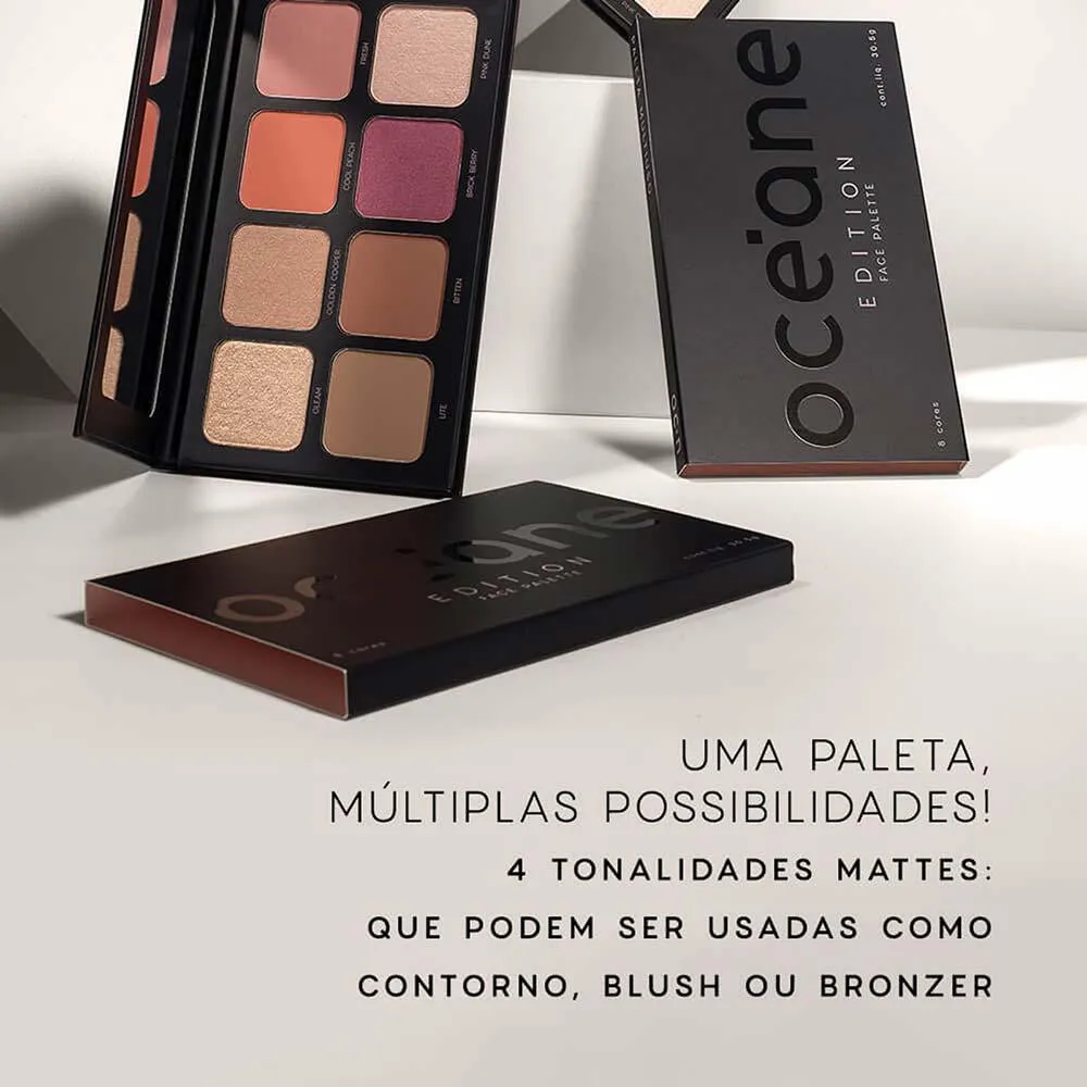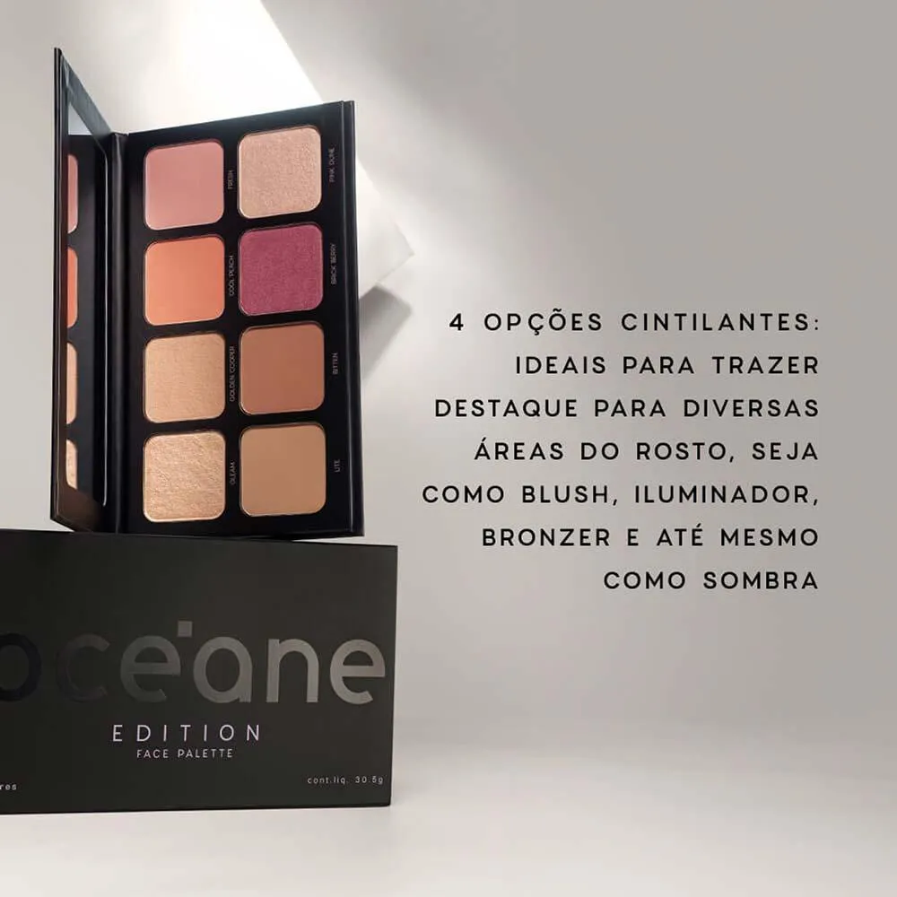 A Paleta Multifuncional Face Palette Océane Edition conta com iluminador, contorno, bronzer e blush. São 4 tons cintilantes e 4 tons matte, todos com alta pigmentação e fixação. Perfeita para levar no nécessaire e criar diferentes makes.