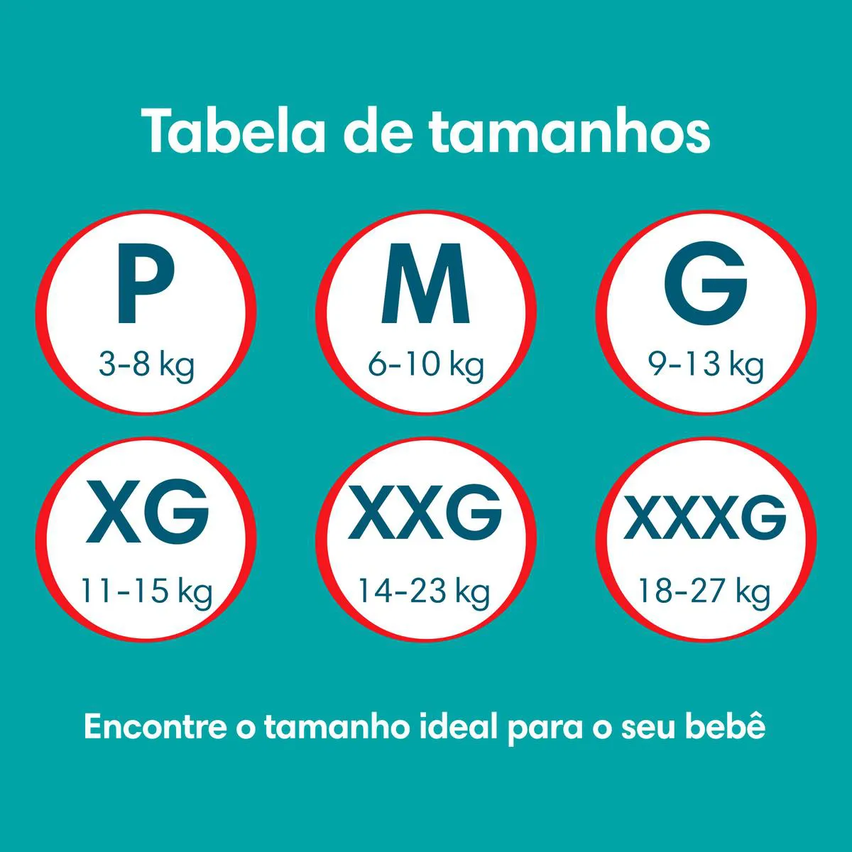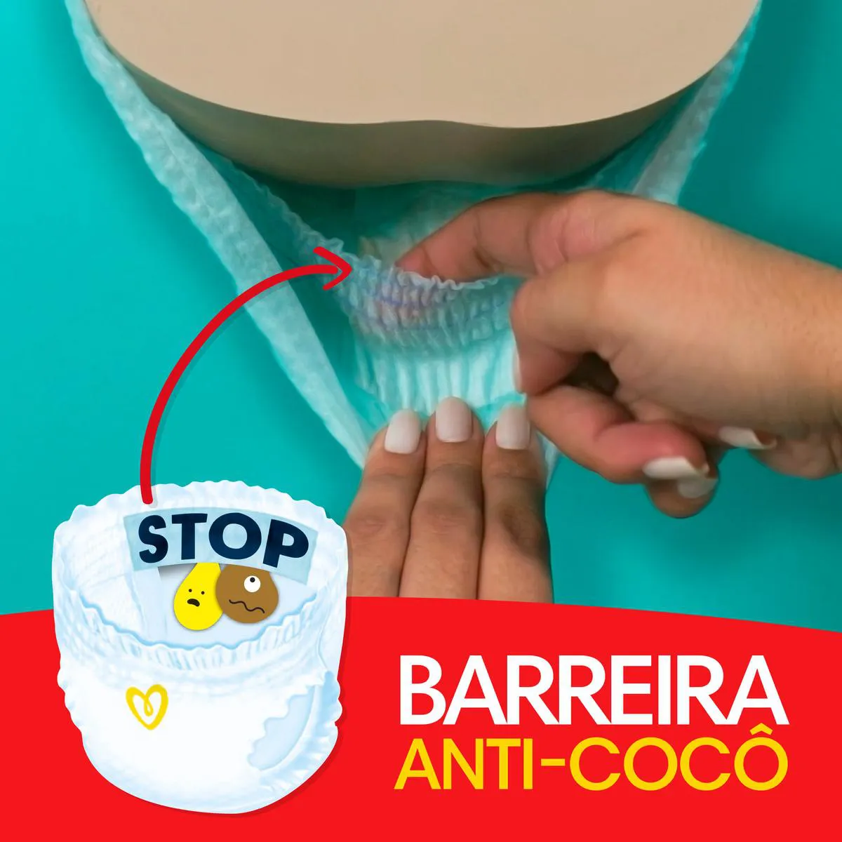 Além disso, conta com canais de ar que permitem que o ar circule pela fralda, arejando a pele e evitando que o bumbum fique abafado. Ainda, vem com um gel mágico e uma camada ultra-absorvente, que absorve e retém a umidade no interior da fralda, mantendo-a sequinha por até 12 horas e protegendo contra assaduras.