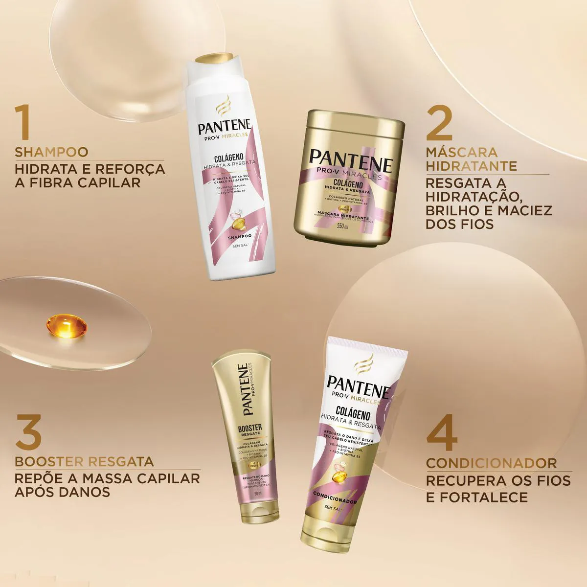 Formulada para cabelos danificados e tratados quimicamente, a máscara Pantene Colágeno Hidrata & Resgata possui fórmula Pro-V Miracles que recupera a hidratação do cabelo, ajudando a manter o cabelo brilhante e macio.