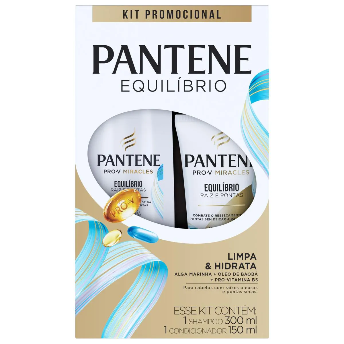 A linha Equilíbrio Pantene da coleção Equilíbrio Raiz e Pontas com óleo de baobá e algas marinhas é feita com complexo Pro-V Miracle, que penetra profundamente nos fios equilibrando os cabelos mistos, com pontas ressecadas ou espigadas, purificando as raízes oleosas e eliminando as impurezas.