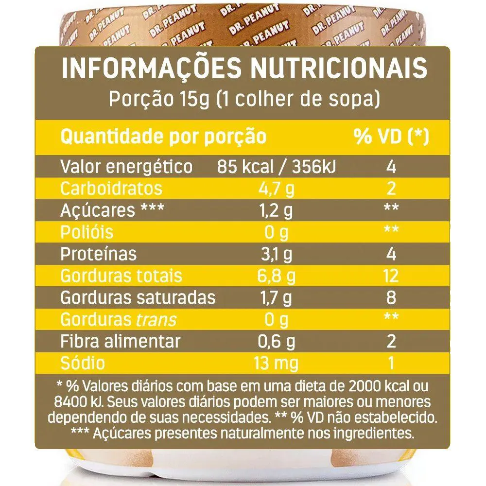 Pasta de Amendoim Dr Peanut é um produto com alto teor de gorduras monoinsaturadas, as gorduras "boas" e vegetais que ajudam a combater o colesterol. Além disso, a pasta de amendoim é rica em vários outros nutrientes, como proteínas e fibras que ajudam você a se sentir saciado, é uma ótima fonte de vitamina e, contém ômega 3 e ômega 6, um ingrediente natural, low-carb, essencial 100% natural antioxidantes e gorduras trans zero. Pasta de Amendoim Dr. é um alimento com baixo teor de carboidratos e calorias que é uma excelente fonte de gordura e proteína para perda de peso ou dietas de construção de massa muscular. Benefícios: