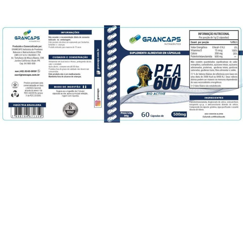 Pea 600 Bio Active Analgésico 60 Cápsulas 500mg Grancaps