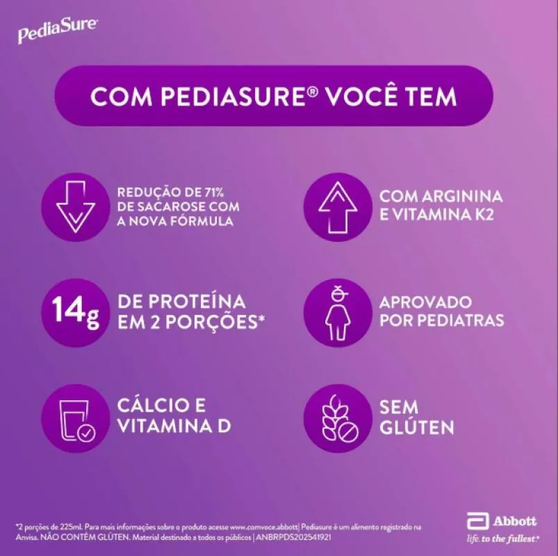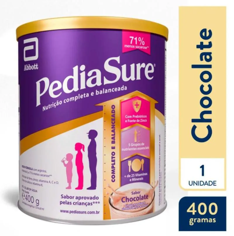 Pediasure é um complemento nutricional infantil com mais de 25 vitaminas e minerais, prebióticos e fonte de zinco, ferro, vitamina a, C e D. Criado para atender as necessidades nutricionais da criança em crescimento, Pediasure contribui para o desenvolvimento da criança e é indicado para nutrição completa e balanceada. Com prebióticos e fonte de Zinco. Mais de 25 vitaminas e minerais. Criado para atender as necessidades nutricionais da criança em crescimento. Alto teor de ferro, zinco, vitamina A, C e D. Contribui para o desenvolvimento da criança. Indicado para nutrição completa e balanceada. Sabor aprovado pelas crianças. Sabor chocolate.