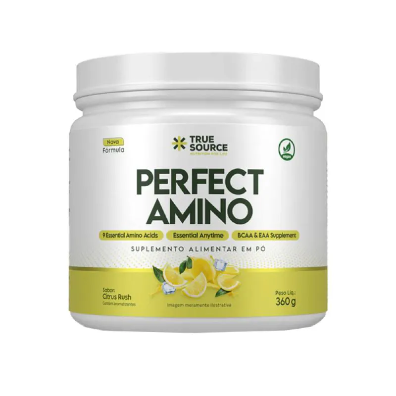 O Perfect Amino Aminoácidos Essenciais True Source é um blend completo e estratégico, formulado para entregar todos os 9 aminoácidos essenciais, além de taurina, vitamina B6, polpa de maçã, compondo uma fórmula 100% natural, limpa e de alta biodisponibilidade.