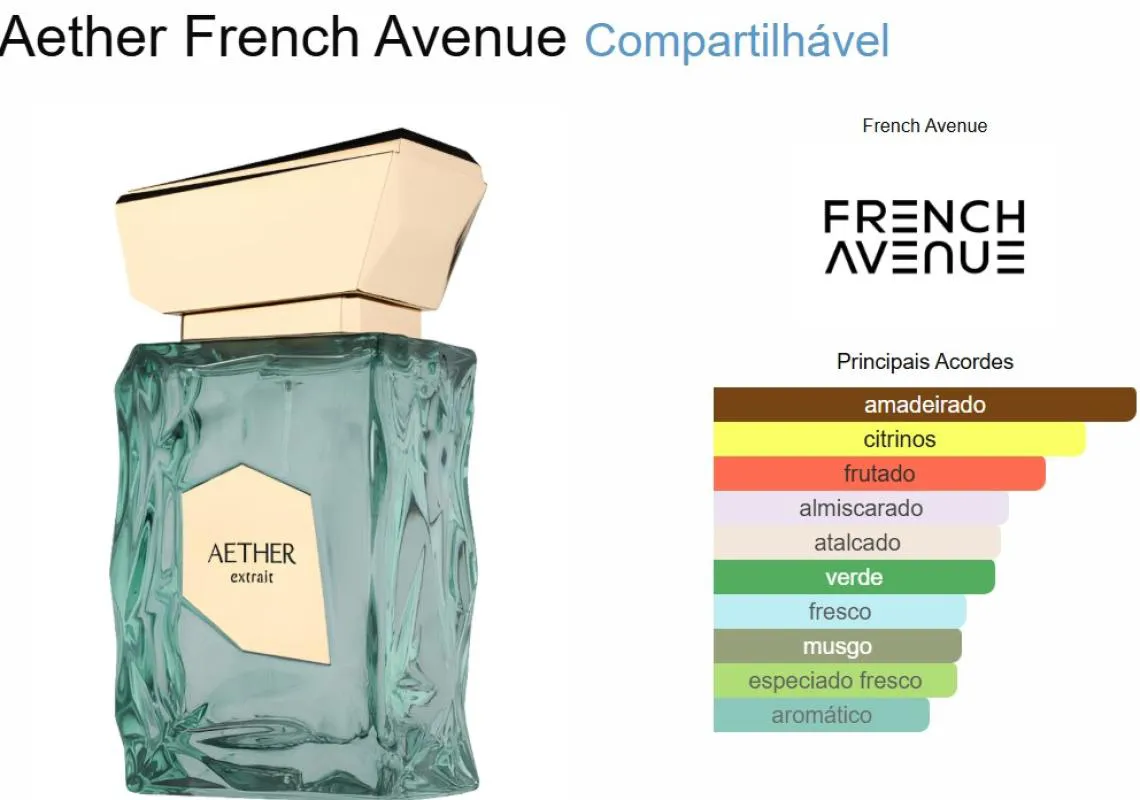 O Extrait de Parfum Aether da French Avenue é uma fragrância sofisticada e magnética que começa com uma explosão fresca de maçã verde, tangerina, laranja e bergamota. No coração, notas florais picantes de petitgrain e violeta se entrelaçam com cedro e cashmeran, criando uma complexidade refinada. A base combina âmbar, líquen e almíscar, proporcionando um rastro quente e cativante que garante uma presença inesquecível.