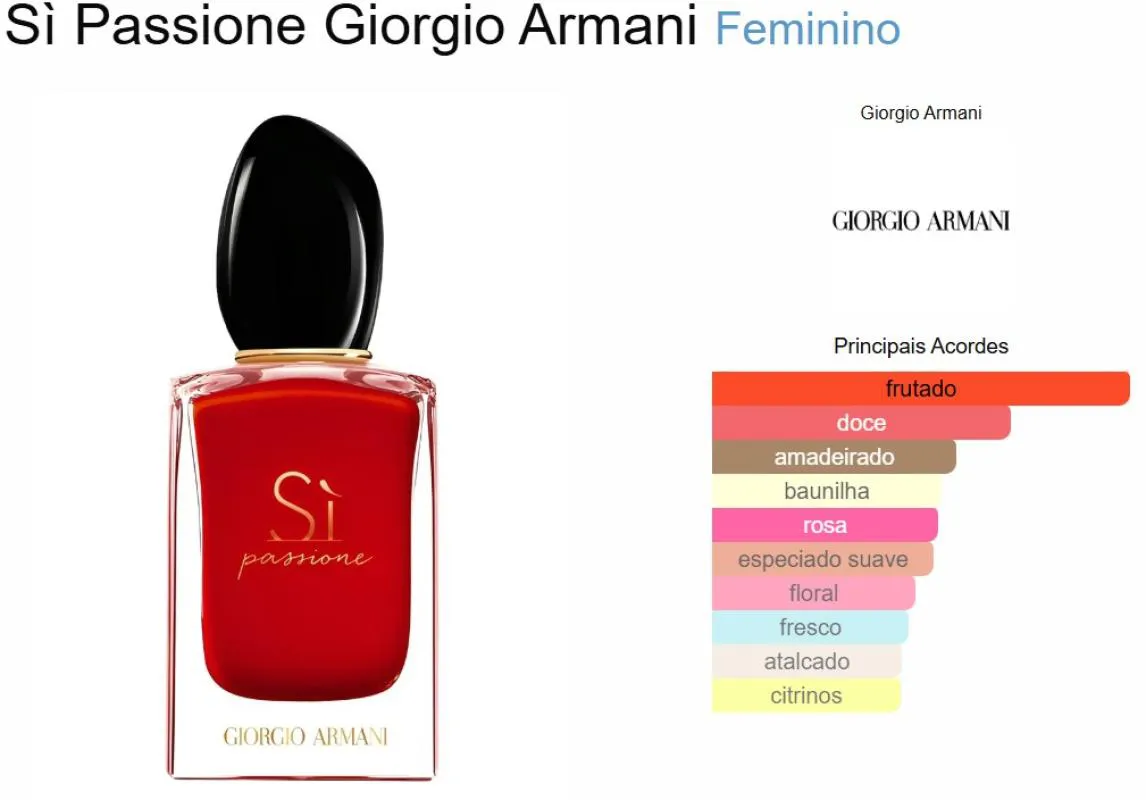 Sì Passione de Giorgio Armani é um perfume Floral Frutado Feminino. Sì Passione foi lançada em 2017. Sì Passione foi criado por Christine Nagel e Julie Massé. As notas de topo são: Pera, Groselha Preta, Pimenta Rosa e Toranja. As notas de coração são: Abacaxi, Rosa, Jasmim e Heliotrópio. As notas de fundo são: Baunilha, Cedro, Patchouli e Madeira de Âmbar.