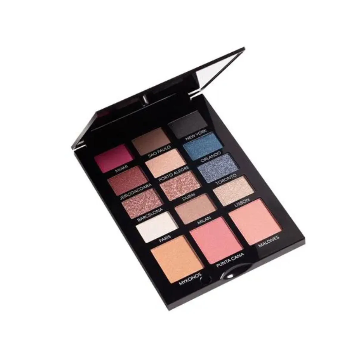 São 12 sombras com texturas mate, cintilante, metálica e pigmentos prensados. Os 3 Blushes são curingas em qualquer produção.