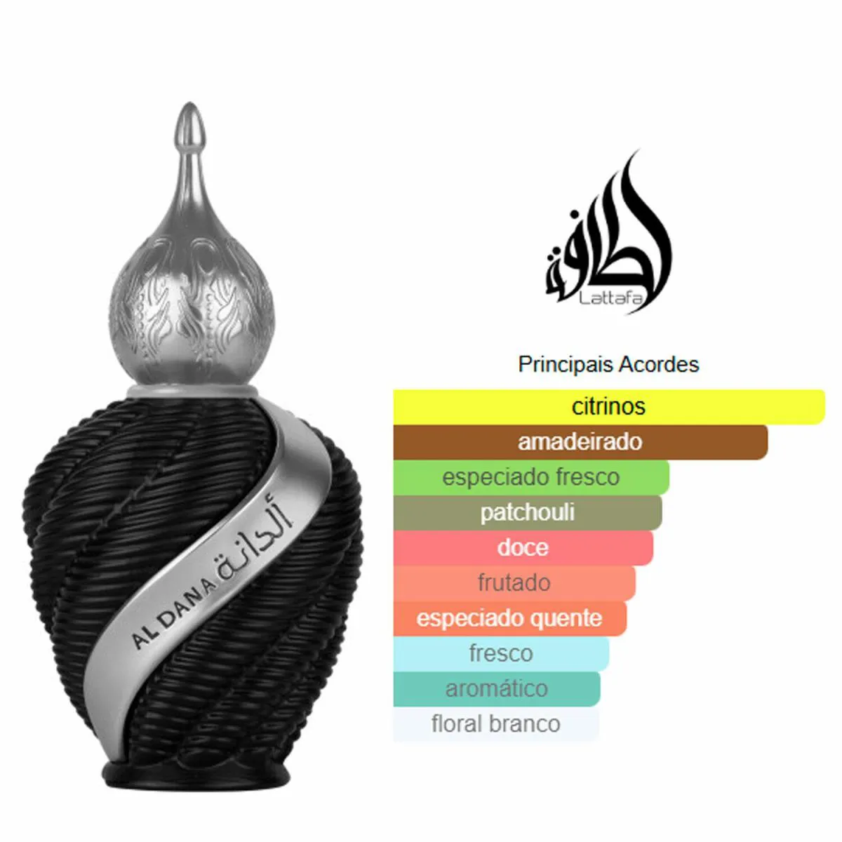 Niche Emarati Al Dana de Lattafa perfumes é um perfume Aromático Frutado Compartilhável. Esta é uma nova fragrância. Niche Emarati Al Dana foi lançado em 2024. As notas de topo são: Abacaxi, Lima, Bergamota, Limão e Pimenta. As notas de coração são: Lírio-do-Vale, Olíbano e Jasmim. As notas de fundo são: Patchouli, Notas Amadeiradas, Fumaça, Almíscar e Âmbar.