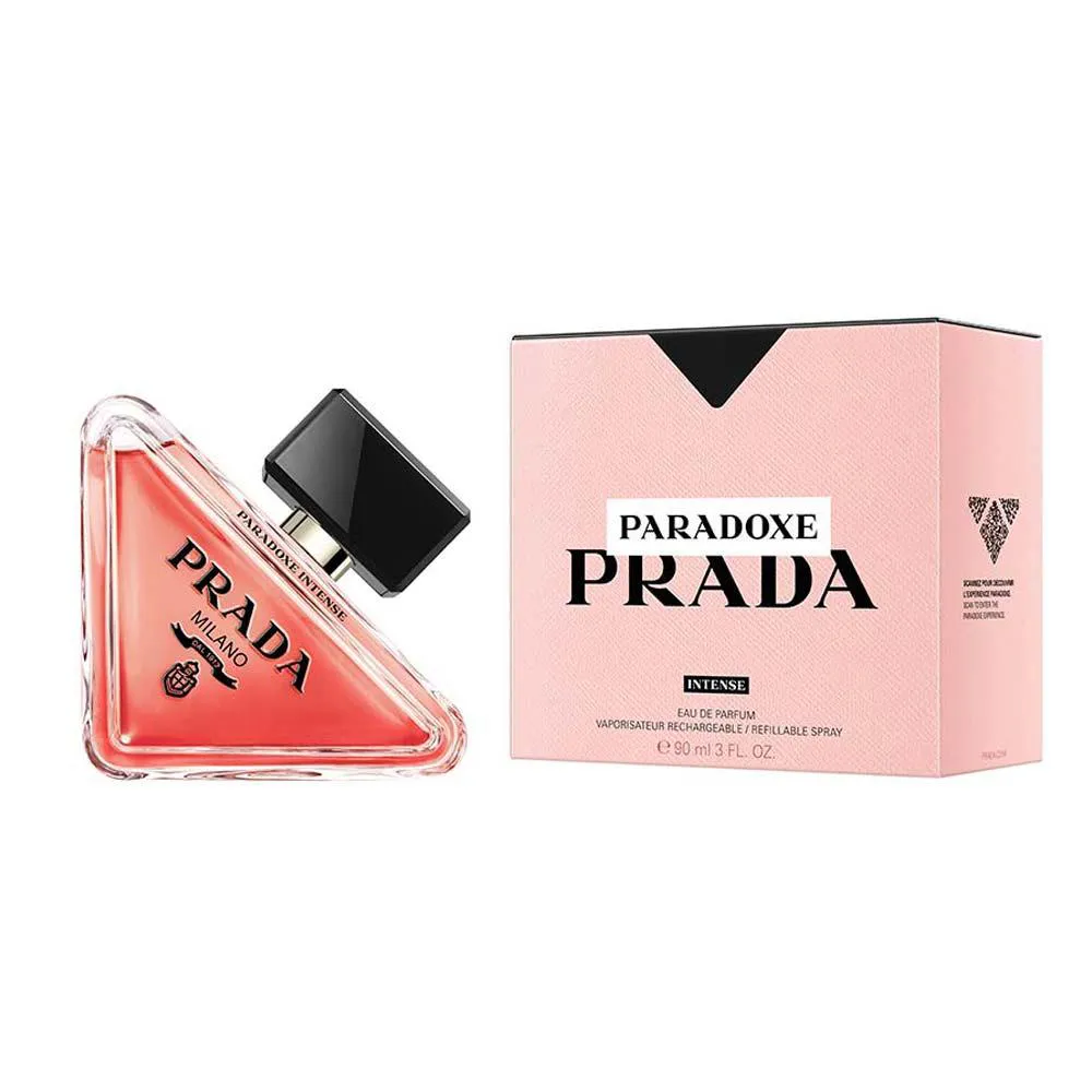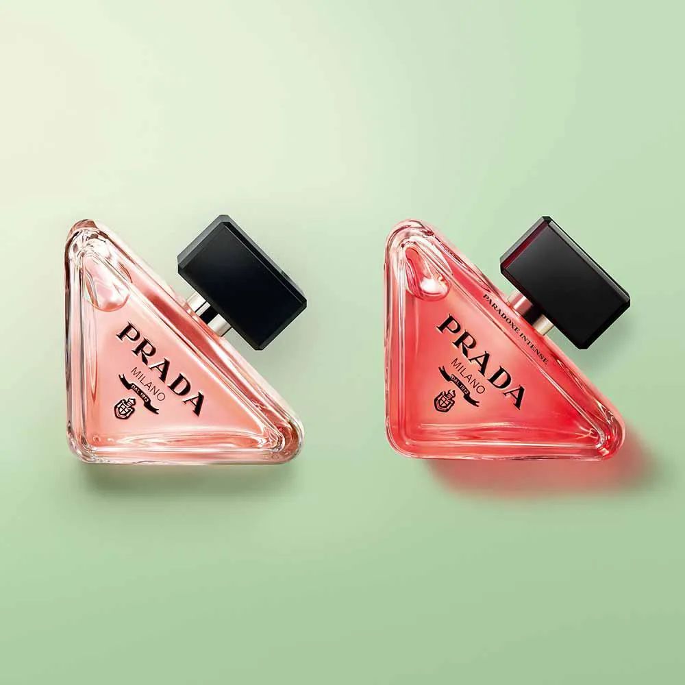 Como a assinatura original, a garrafa renovada da Paradoxe Intense é uma expressão da essência da casa de reinvenção e predileção por contrastes. Em uma mudança da arquitetura tradicional do frasco de perfume, o flacon é minimalista e delicado à primeira vista, inspirado no icônico logotipo triângulo da Prada original, projetado de forma disruptiva para descansar em sua lateral.