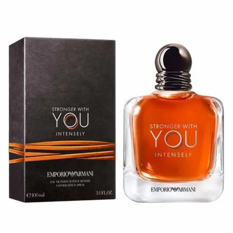 Stronger With You Intensely a nova e intensa fragrância masculina da Emporio Armani. Este perfume é baseado em um acorde de baunilha quente e vibrante acorde de madeira ambarada e contrastado com uma audaciosa nota de pimenta rosa. A cor de conhaque envelhecido incorpora perfeitamente o caráter intenso da fragrância.